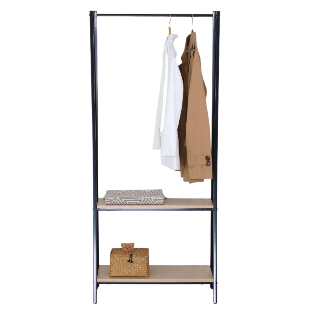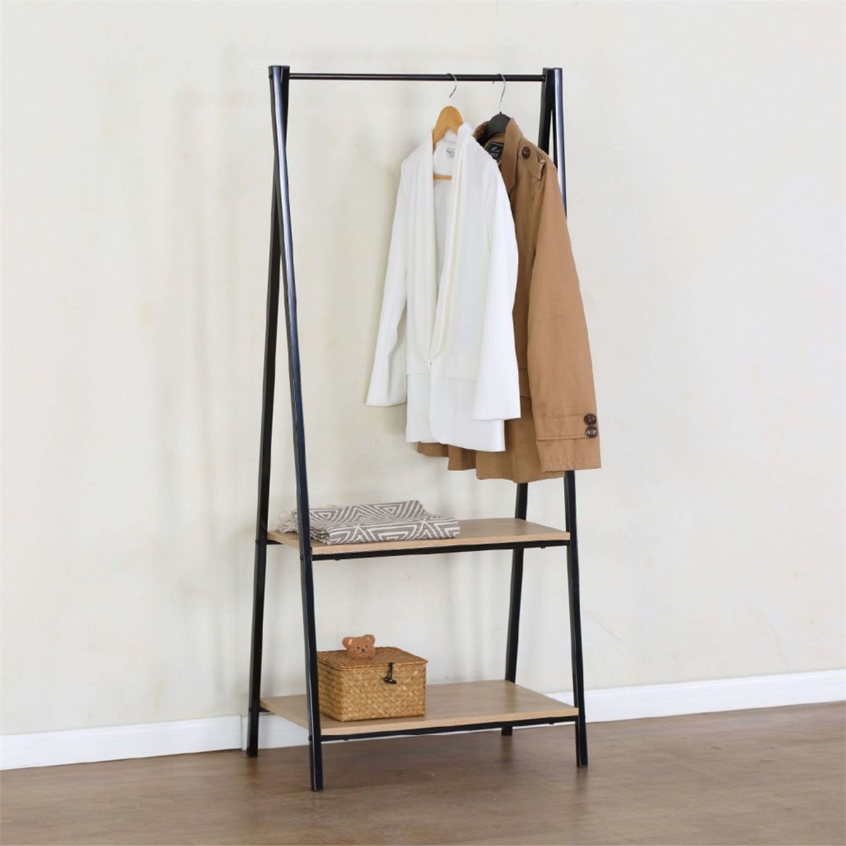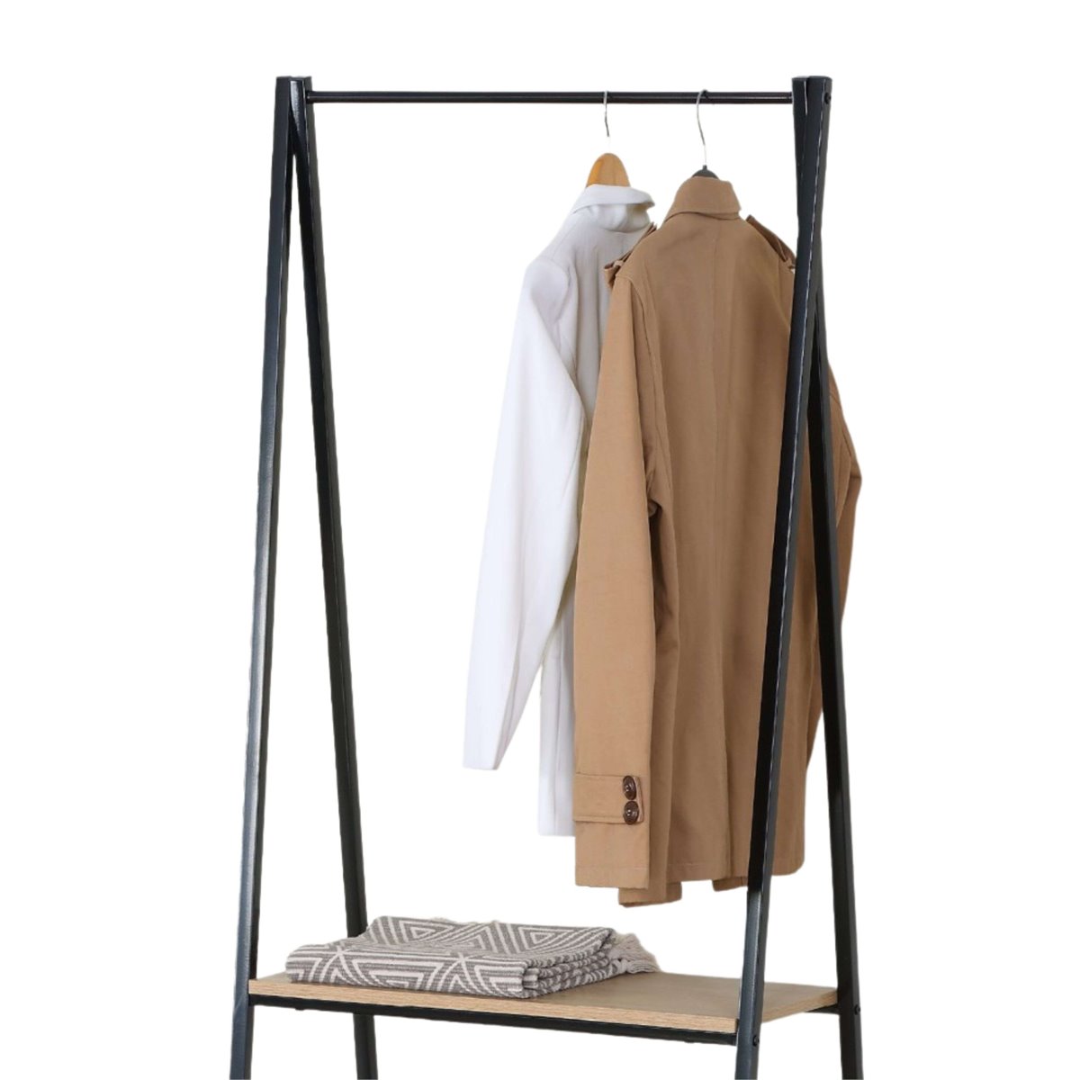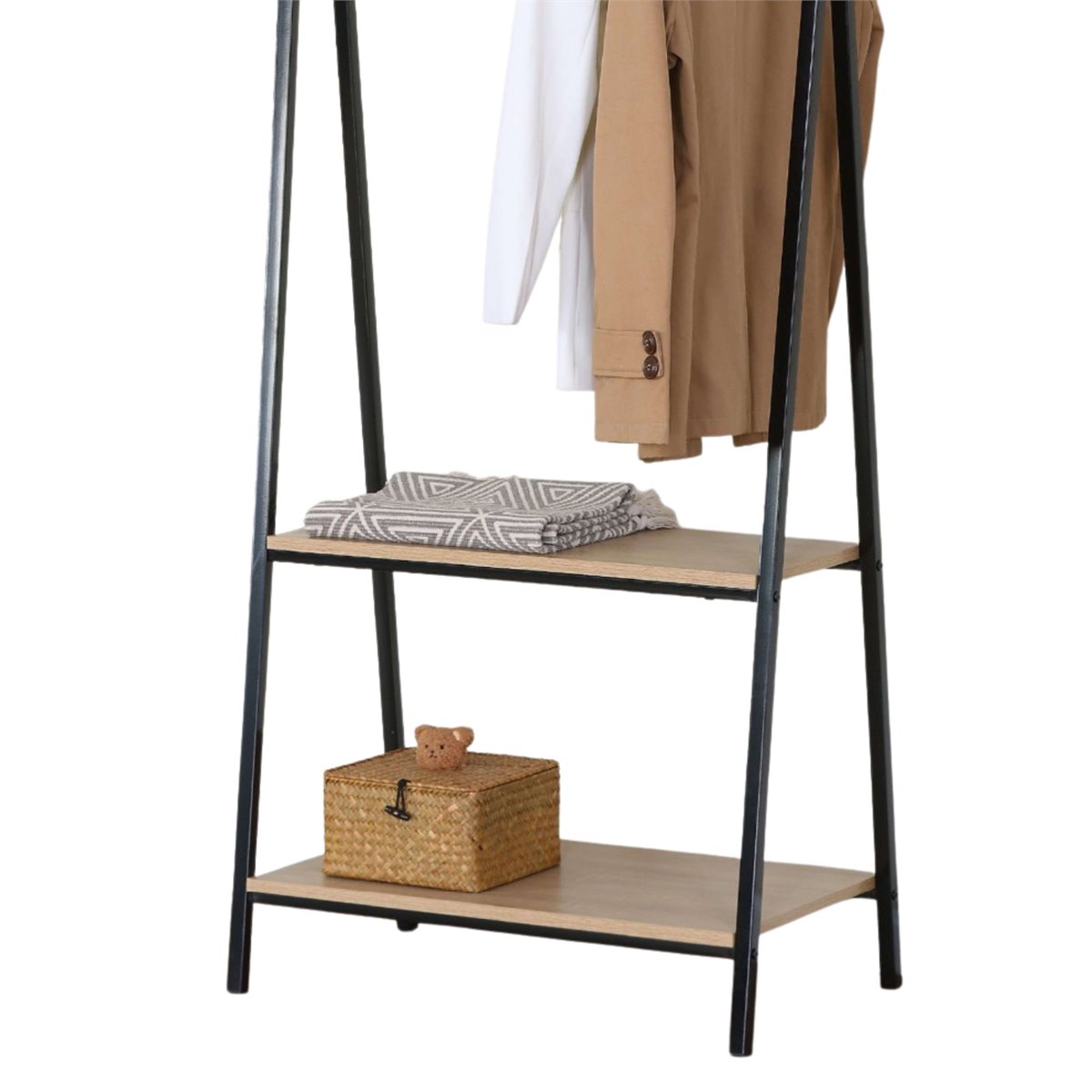 El burro de ropa en tonos negro y roble cambrian genera un contraste visual moderno y atractivo, aportando un toque contemporáneo y acogedor a cualquier espacio. Es ideal para dormitorios, vestidores o recibidores, elevando la atmósfera decorativa con su estructura estilizada. Su impacto visual articula una integración armoniosa entre el estilo contemporáneo y la calidez de la madera clara, mejorando la percepción estética de tu hogar con sutileza y encanto. Fabricado en melamina, este burro de ropa combina estructura metálica y acabados que realzan su funcionalidad. Mide 64x150 cm y cuenta con 2 estantes ideales para mantener ropa o accesorios en orden, maximizando el espacio disponible. Es una solución ideal para organizar diversas prendas y mantener un acceso rápido. Compra este versátil burro de ropa ahora y transforma la eficacia de tu almacenamiento diario. Medidas: Ancho: 64 cm, Alto: 150 cm, Profundidad: 40 cm. Se trata de mobiliario con kit de montaje, que incluye manual de instrucciones y tornillería.