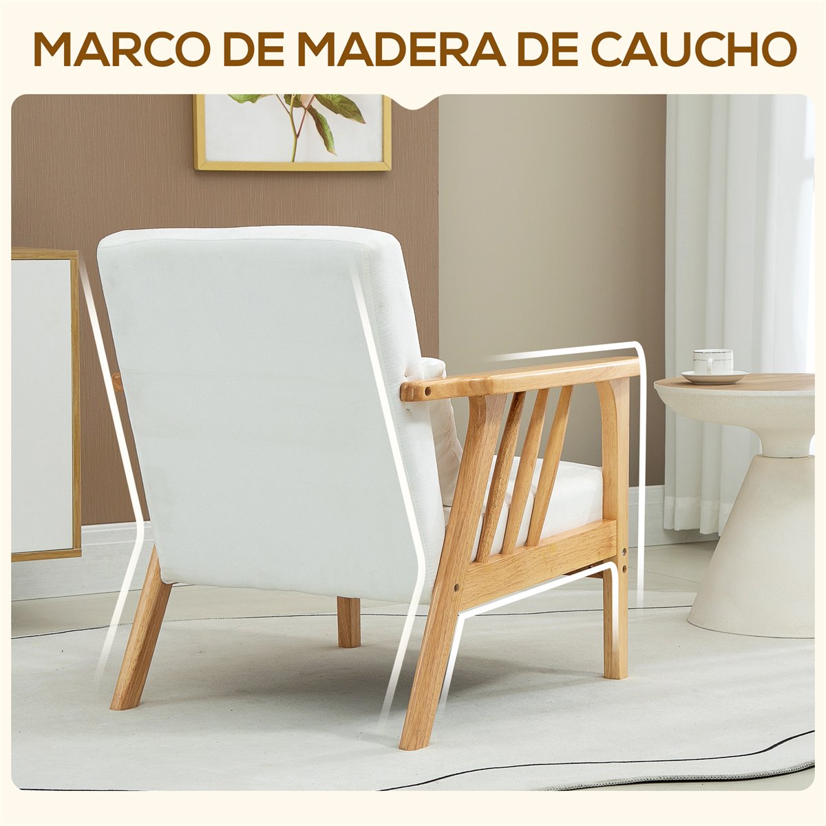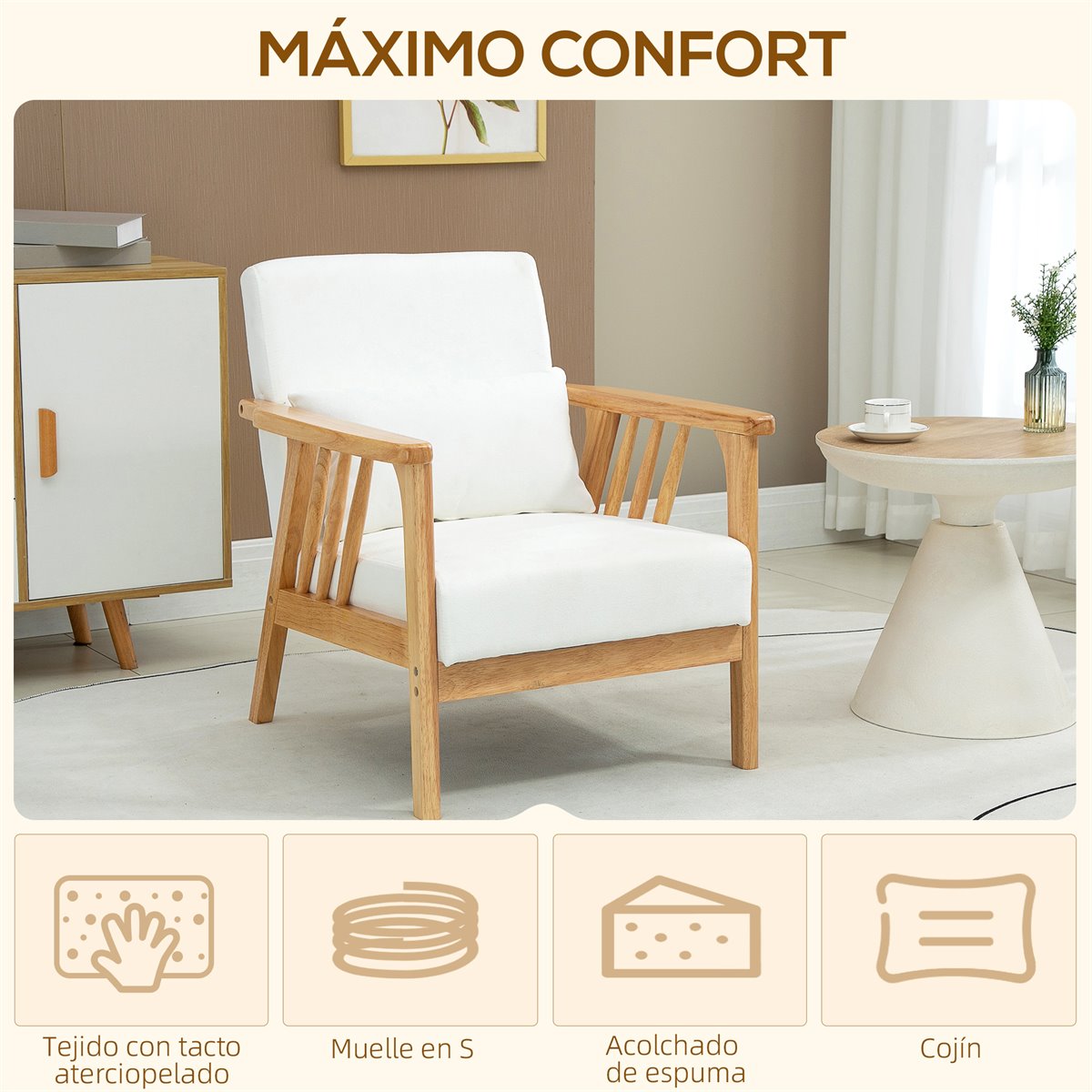 ¡Renueva tu hogar con esta butaca de HOMCOM! Fabricado en resistente madera de caucho, este sillón es estable e ideal para un uso prolongado. Gracias a la superficie de tacto aterciopelado y a los muelles en S bajo el asiento acolchado, este sillón ofrece un confort perfecto para pasar horas de relax. Además, su diseño original y único y sus colores neutros encajarán a la perfección en cualquier ambiente y aportarán un toque de elegancia.