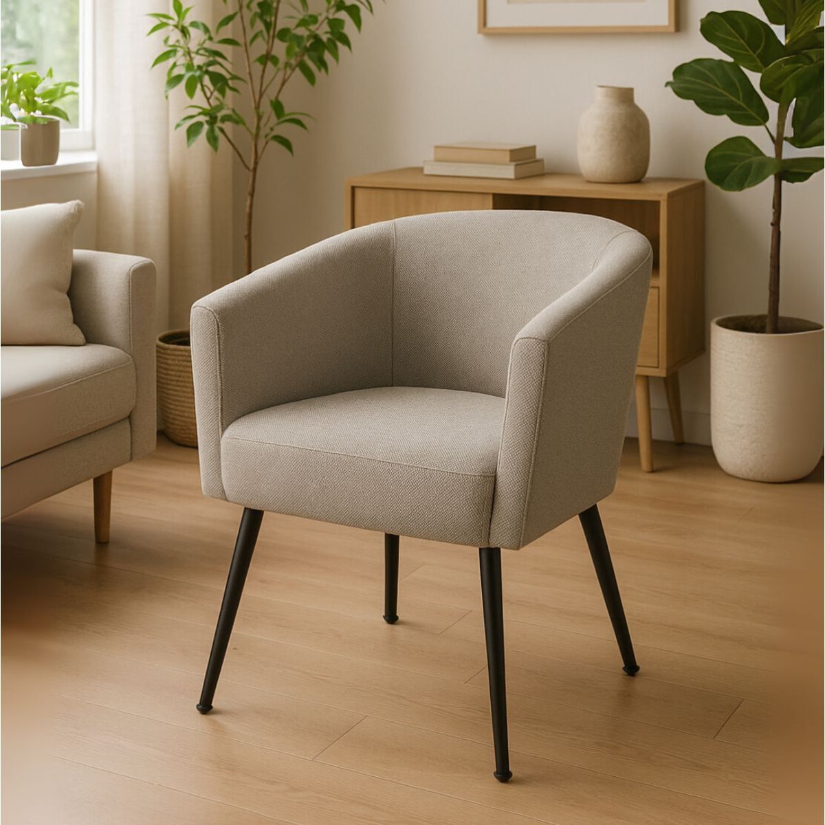 La butaca modelo Melrose es el complemento perfecto para la decoración de tu hogar. Un espacio pensado para el descanso y la tranquilidad, ideal para disfrutar de largas lecturas o de agradables conversaciones con familiares y amigos. Su diseño actual, con un marcado estilo nórdico y tapizado en borreguillo, crea un ambiente cálido y acogedor en cualquier estancia.