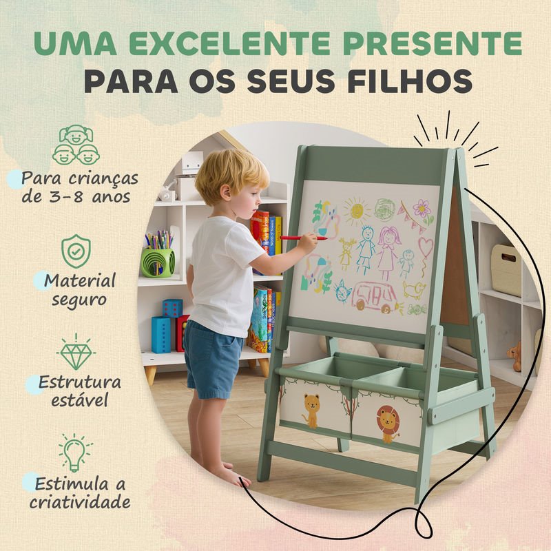 Despierta la imaginación de tu peque con el caballete para niños de AIYAPLAY 3 en 1, que incluye pizarra de tiza, pizarra blanca de doble cara y soporte para rollo de papel. Con dos cajas espaciosas para guardar lápices y pinceles, tendrás todo a mano para crear. Fabricado en madera de pino y MDF, la pizarra con caballete infantil combina resistencia con un encantador acabado verde y divertidos detalles de leones, ideal para disfrutar del arte y la creatividad.