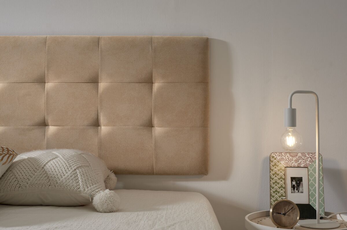 - Cabecero de aglomerado con refuerzo trasero, acolchado de espuma y tapizado en tela Imola (Aquaclean).