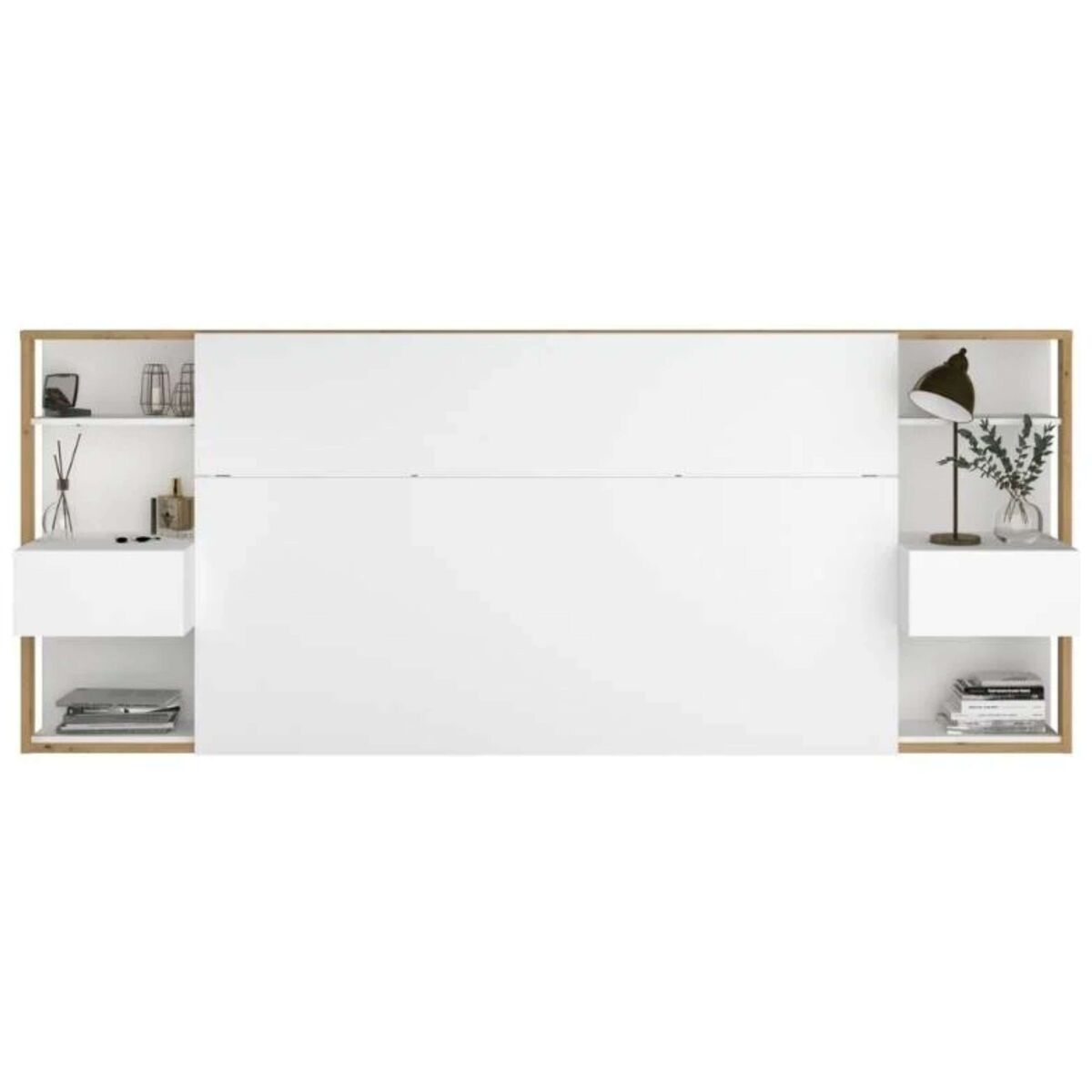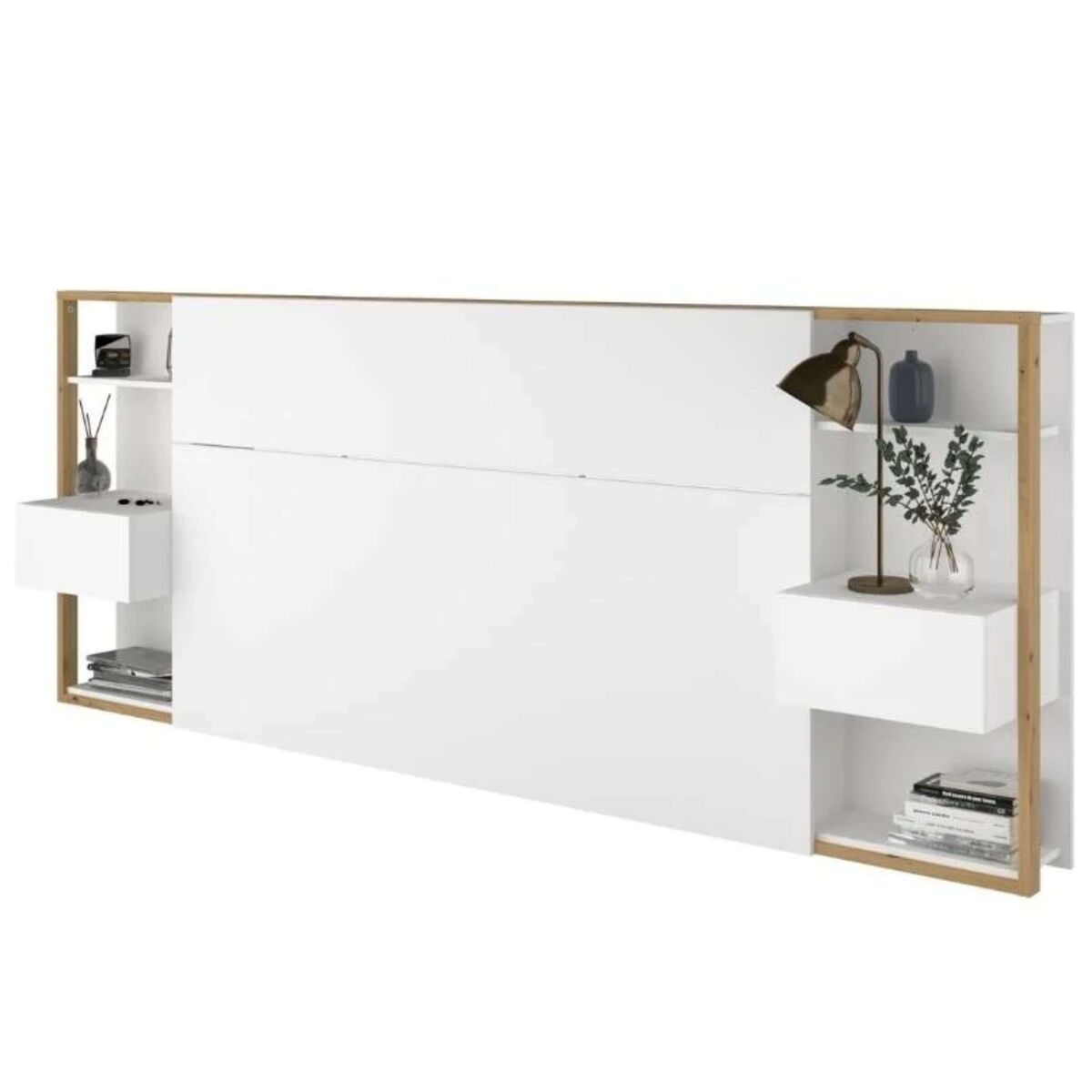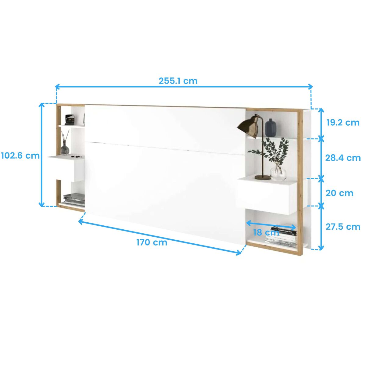 Cabecero cama de matrimonio Line acabado en color blanco con los bordes roble Artisan, un mueble completo y funcional para el dormitorio. Este cabecero es compatible con camas de 150 cm y ofrece una buena capacidad de almacenaje, ya que incluye varios compartimentos. ¡Completa tu dormitorio de matrimonio con el cabecero Line! Cabecero de estilo nórdico fabricado en melamina de alta calidad. En su estructura incorpora dos cajones con guías de rodillos y amortiguadores, los cuáles podrás utilizar como mesitas de noche, y tres huecos en cada lateral para que coloques aquellos objetos que necesites tener a mano cuando estés en la cama. No se incluyen la cama, el resto de muebles ni los objetos decorativos de las imágenes.Medidas: Cabecero Alto 103 cm Ancho 255 cm Profundo 36 cm Profundo del cajón 29 cm. Profundo hueco grande 33 cm. Profundo hueco pequeño 18 cm. Se trata de mobiliario con kit de montaje, que incluye manual de instrucciones y tornillería.
