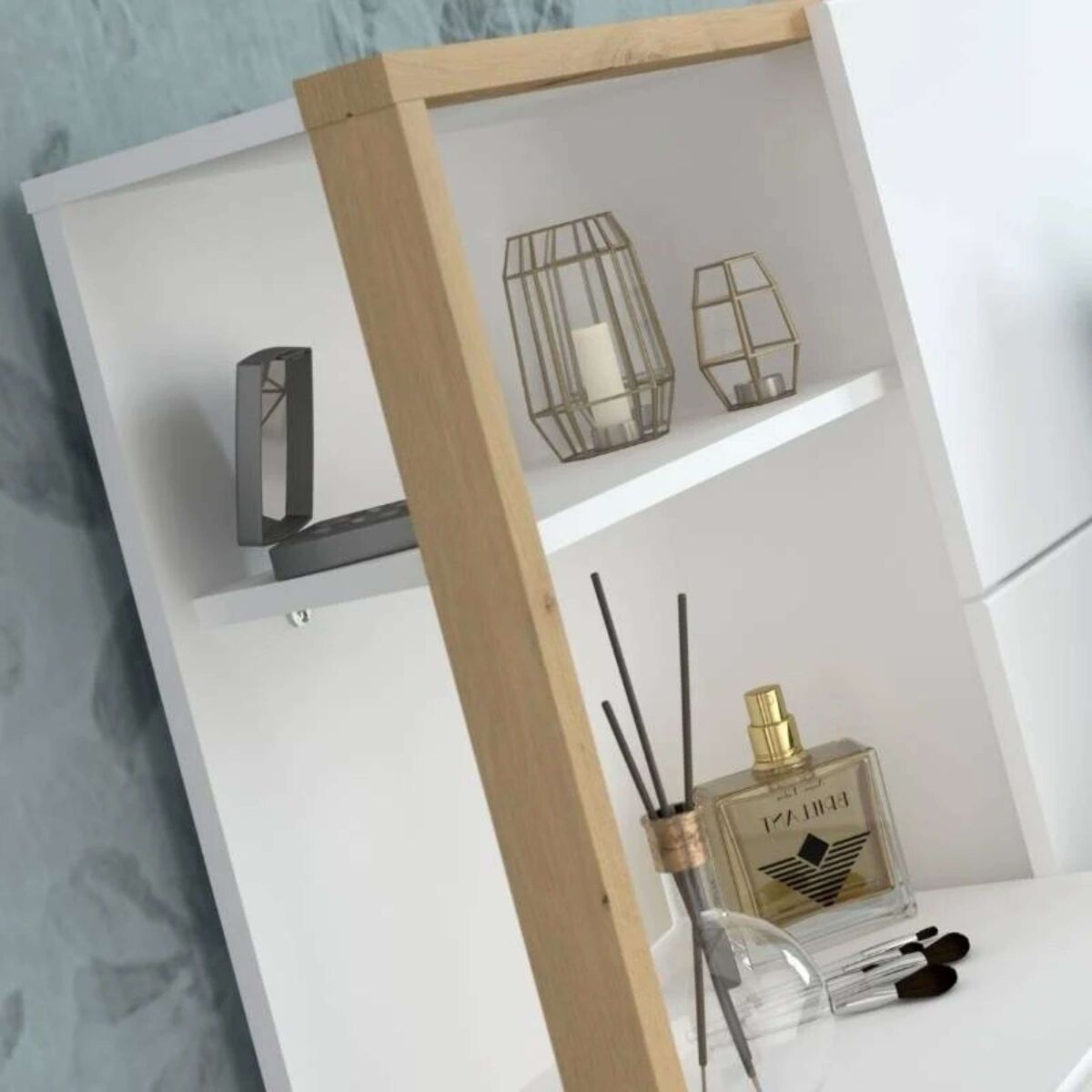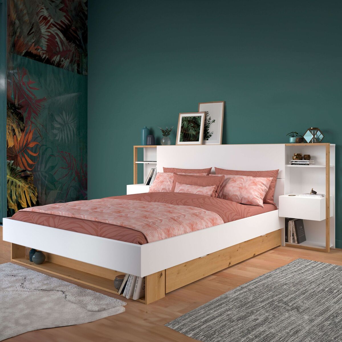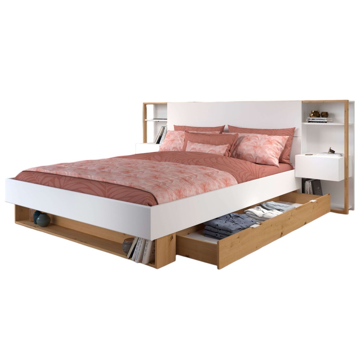Cabecero cama de matrimonio Line acabado en color blanco con los bordes roble Artisan, un mueble completo y funcional para el dormitorio. Este cabecero es compatible con camas de 150 cm y ofrece una buena capacidad de almacenaje, ya que incluye varios compartimentos. ¡Completa tu dormitorio de matrimonio con el cabecero Line! Cabecero de estilo nórdico fabricado en melamina de alta calidad. En su estructura incorpora dos cajones con guías de rodillos y amortiguadores, los cuáles podrás utilizar como mesitas de noche, y tres huecos en cada lateral para que coloques aquellos objetos que necesites tener a mano cuando estés en la cama. No se incluyen la cama, el resto de muebles ni los objetos decorativos de las imágenes.Medidas: Cabecero Alto 103 cm Ancho 255 cm Profundo 36 cm Profundo del cajón 29 cm. Profundo hueco grande 33 cm. Profundo hueco pequeño 18 cm. Se trata de mobiliario con kit de montaje, que incluye manual de instrucciones y tornillería.