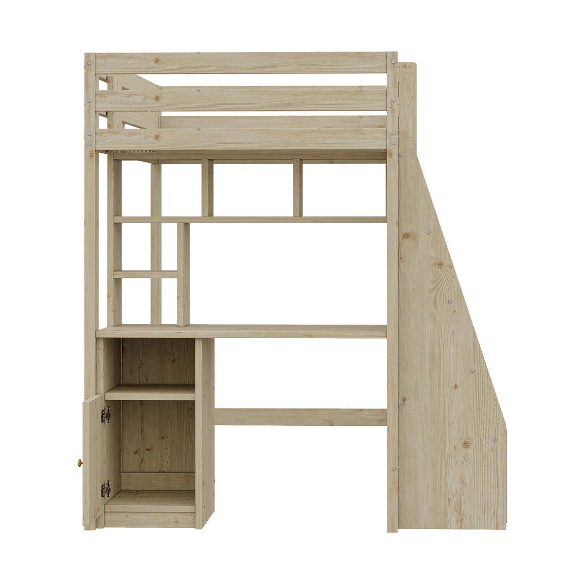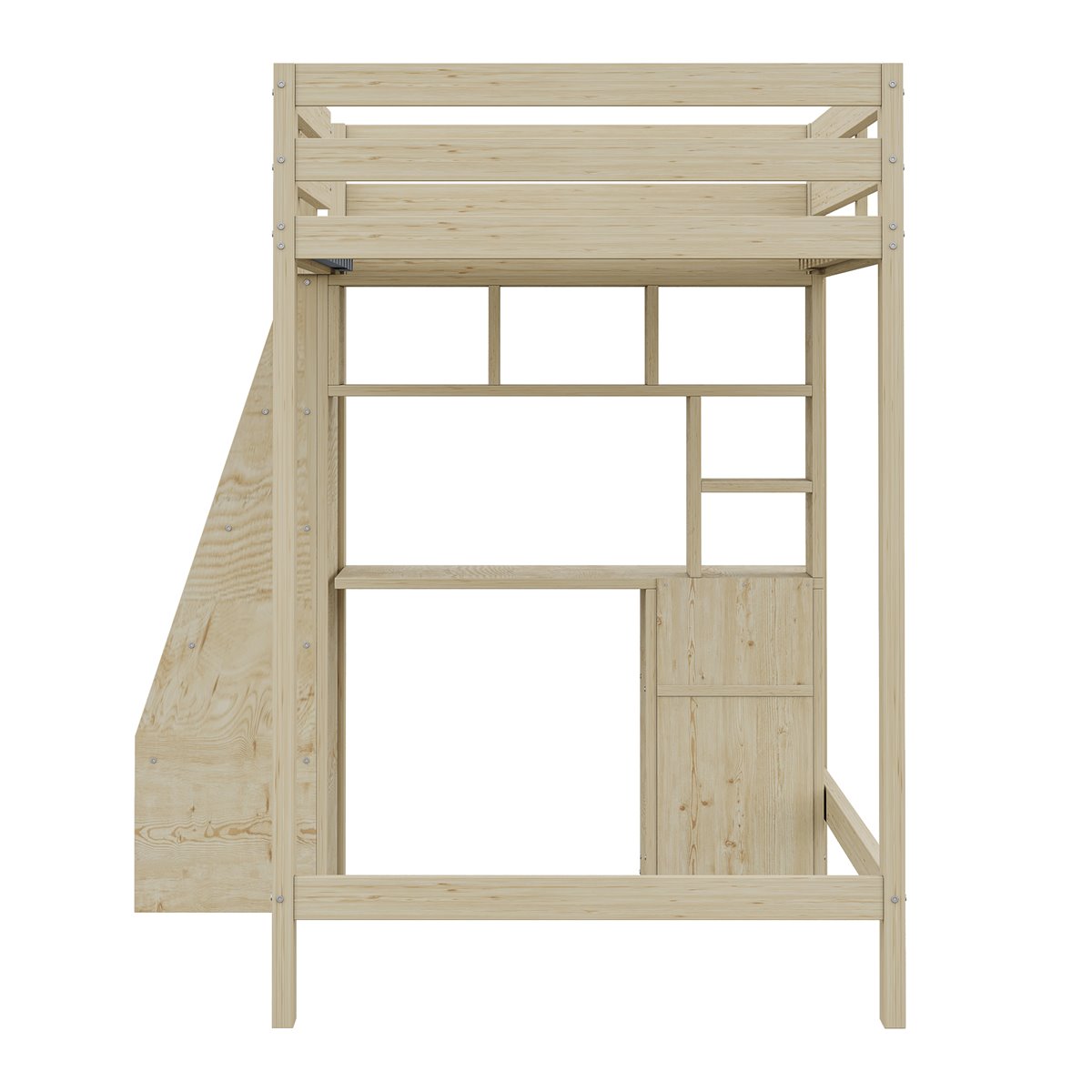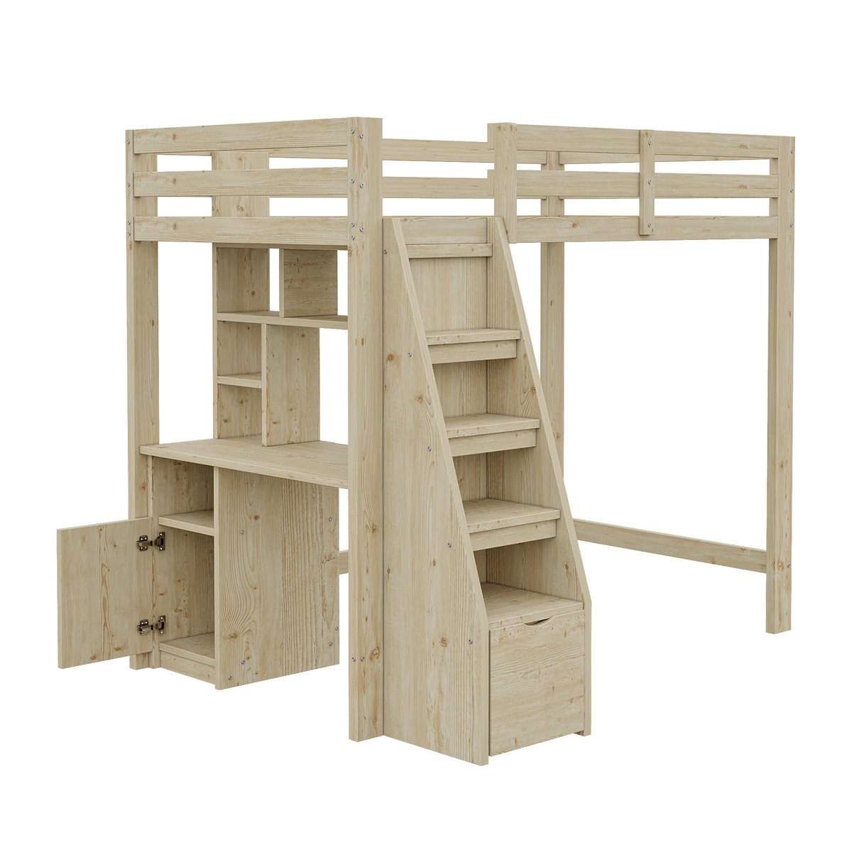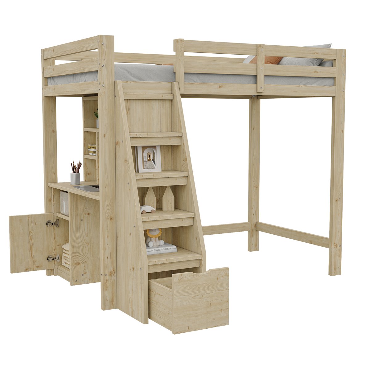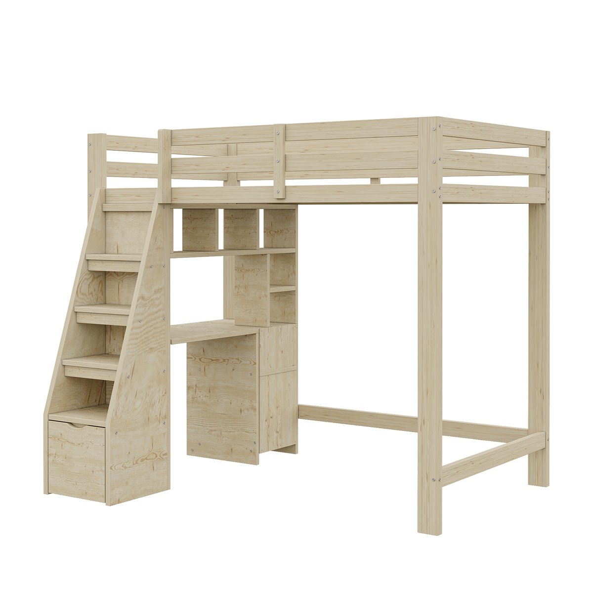 - Escalera con almacenamiento y diseño seguro: La escalera de acceso al loft incluye almacenamiento en cada peldaño, y está diseñada para ser segura y cómoda de usar. Además, la cama está equipada con un cajón para más espacio de almacenamiento, perfecto para juguetes, libros y otros objetos.