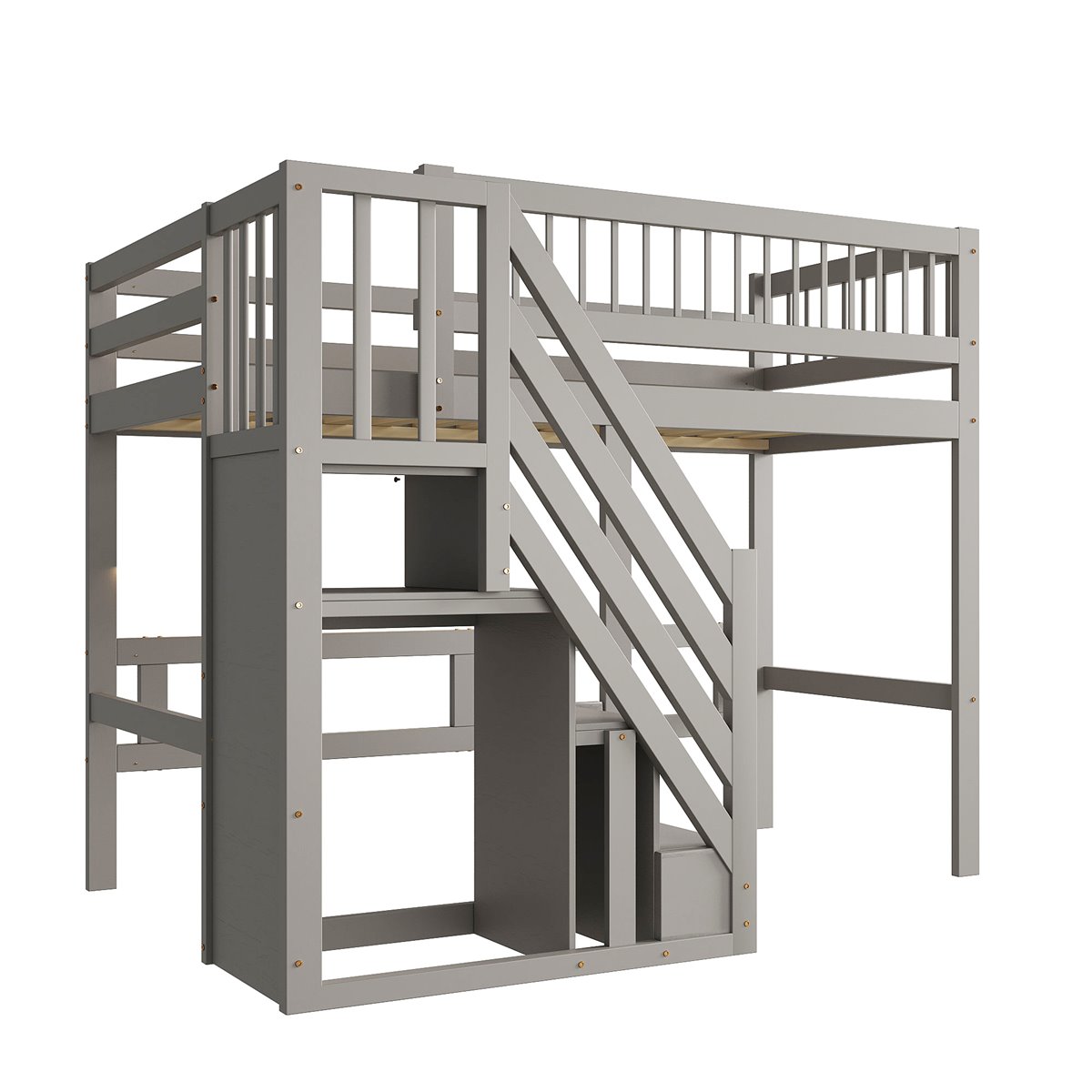 - Escalera con armarios de almacenamiento integrados: Cada peldaño funciona como un espacioso compartimento para organizar juguetes, ropa, libros y otros objetos, manteniendo el dormitorio ordenado y funcional.