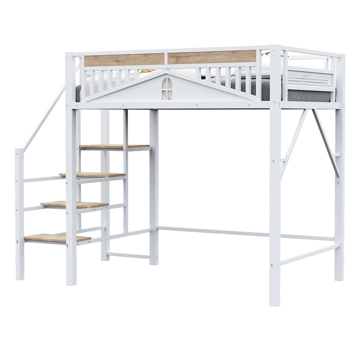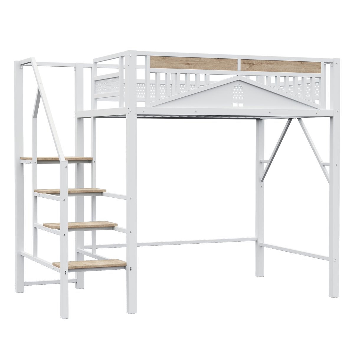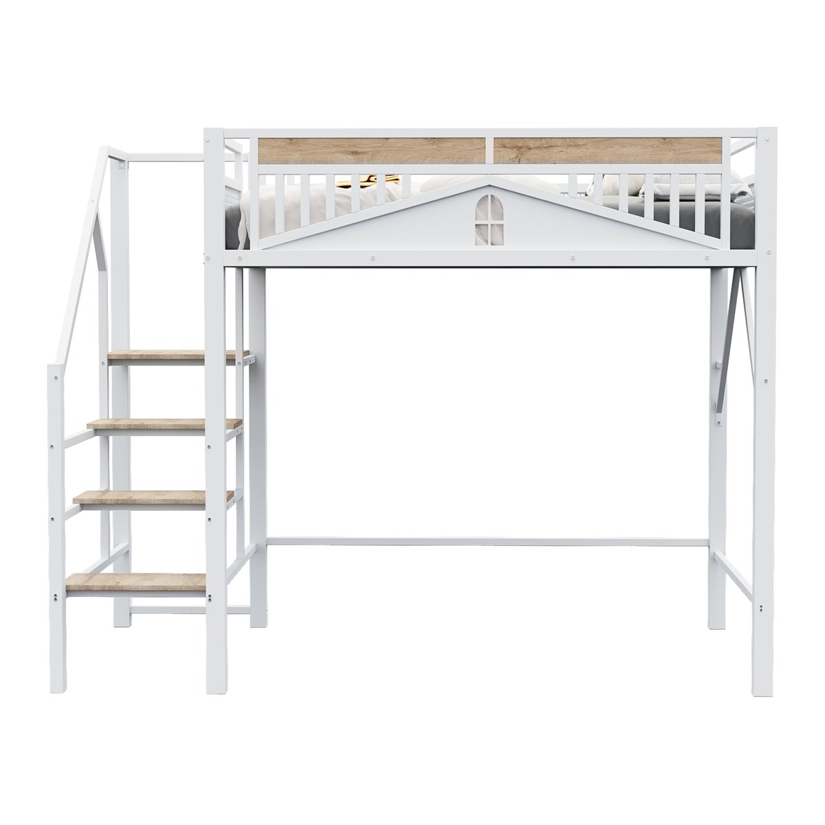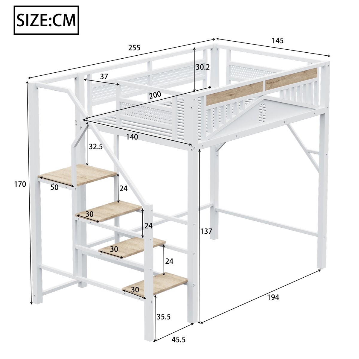 Este loft metálico de 140x200 cm combina seguridad, funcionalidad y estética, siendo ideal para habitaciones con poco espacio. Con un robusto marco de metal y disponible en blanco, este loft presenta una estructura con una escalera de seguridad lateral, un diseño único de ventana en el panel lateral y un gran espacio de almacenamiento debajo, perfecto para organizar juguetes, libros o materiales de estudio.