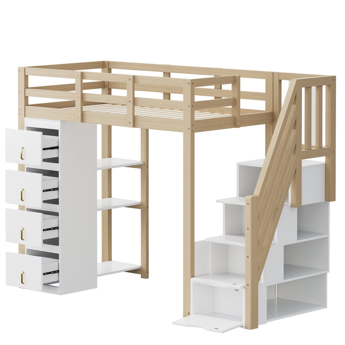 - Escalera lateral de seguridad con cajones integrados que facilitan el acceso seguro a la cama y ofrecen espacio adicional para guardar pertenencias.