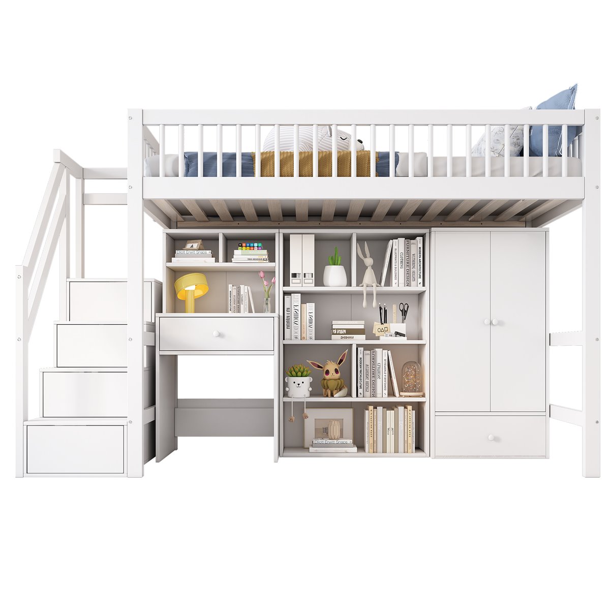 Cama infantil multifuncional 90x200 con escritorio, escalera y armario, diseñada para ofrecer un espacio de descanso y estudio completo. Su diseño versátil permite intercambiar la posición de la escalera y cuenta con barreras de seguridad que facilitan el acceso para los niños. Incluye almacenamiento en cajones, casilleros y armarios, optimizando el espacio y manteniendo el dormitorio ordenado. La cama fomenta hábitos de estudio al incluir un escritorio integrado, proporcionando un lugar propio para aprender y concentrarse. Fabricada en madera maciza y MDF, garantiza durabilidad, estabilidad y seguridad, mientras que su acabado blanco aporta luminosidad y se integra fácilmente con distintos estilos de decoración.