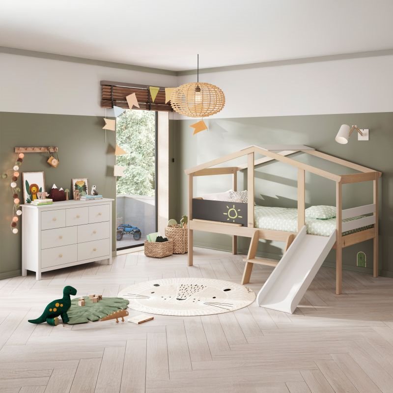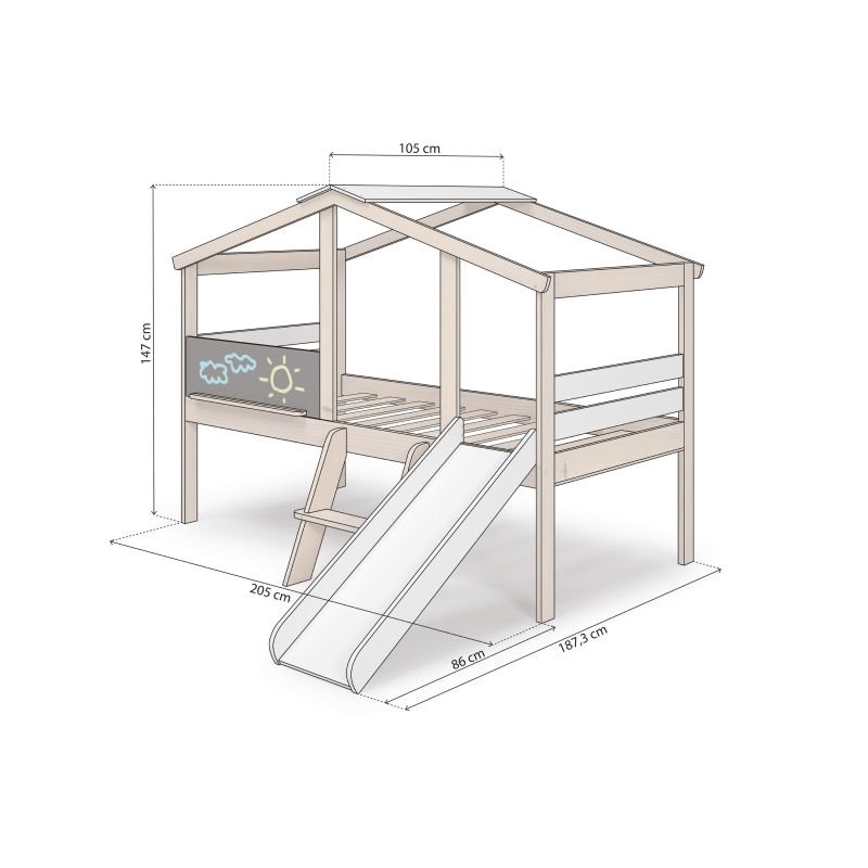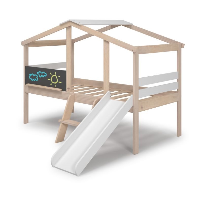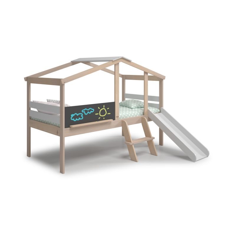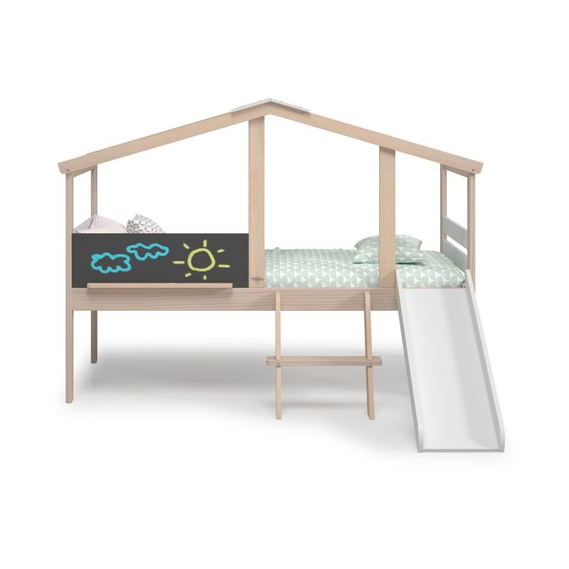 - Cama cabaña infantil con tobogán y pizarra decorativa