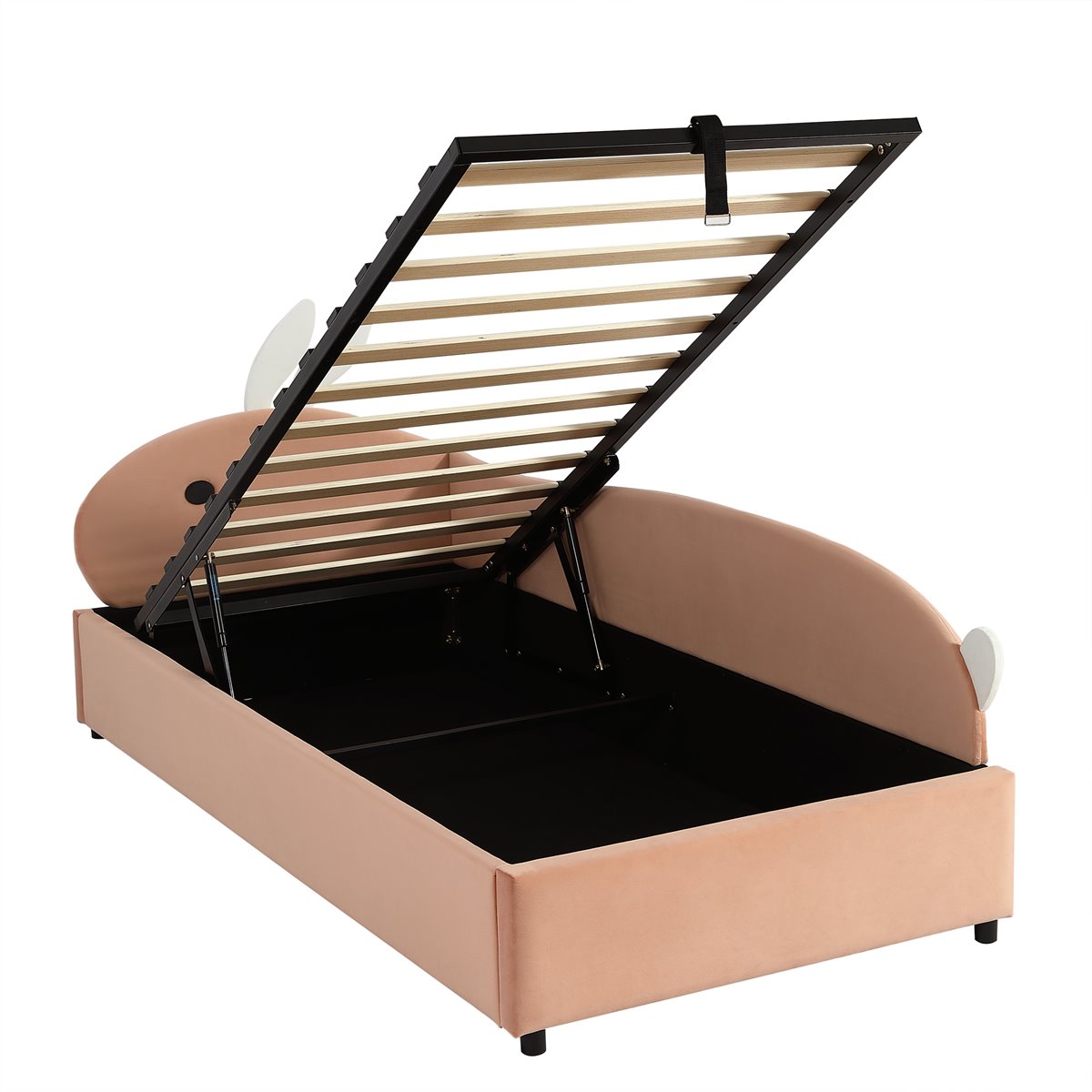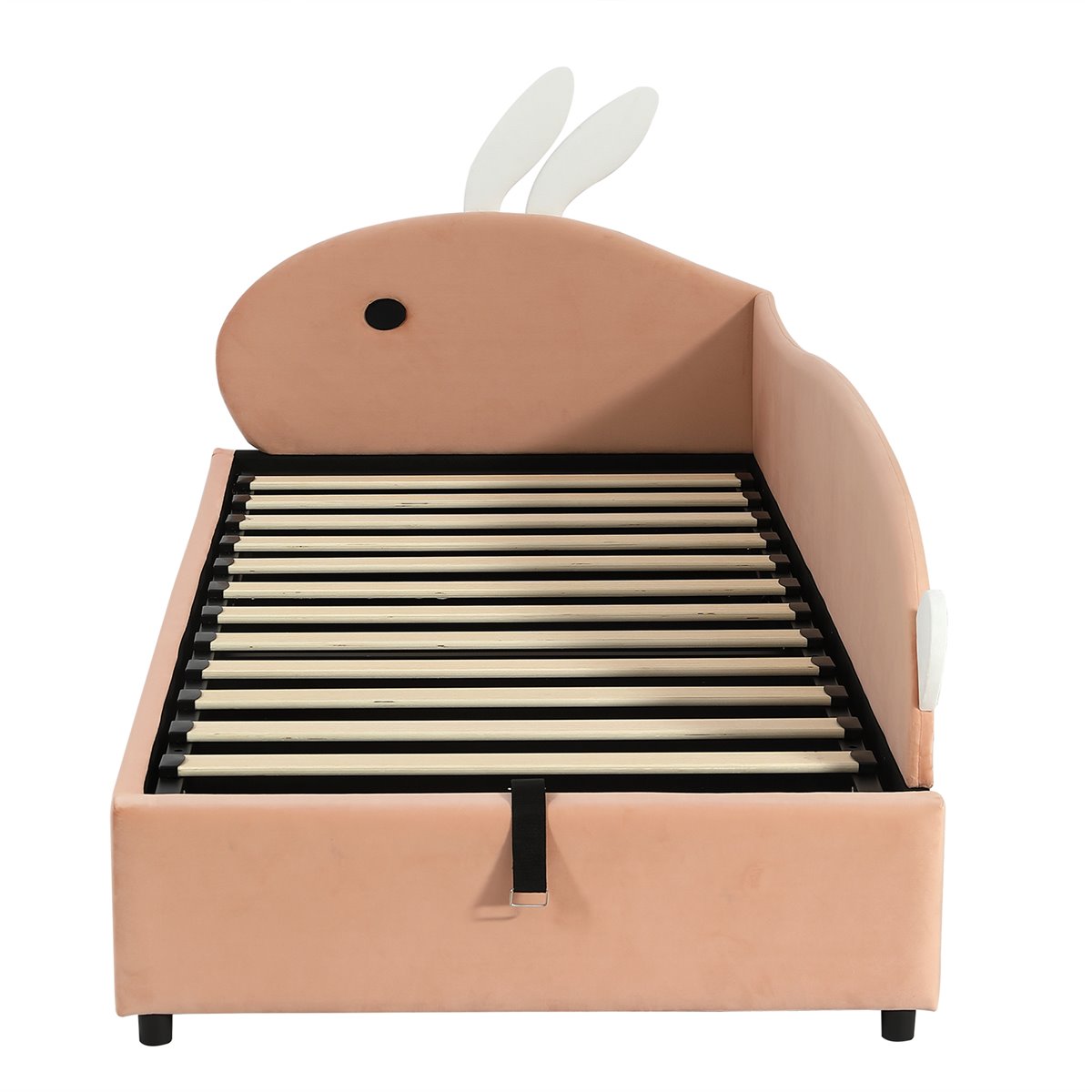 Adorable diseño de conejito: Esta cama infantil tapizada luce un adorable cabecero de conejito que le da un encanto tierno y divertido. Confeccionada en suave terciopelo en una combinación de colores rosa y blanco, irradia calidez y simpatía, perfecta para conquistar el corazón de los niños.