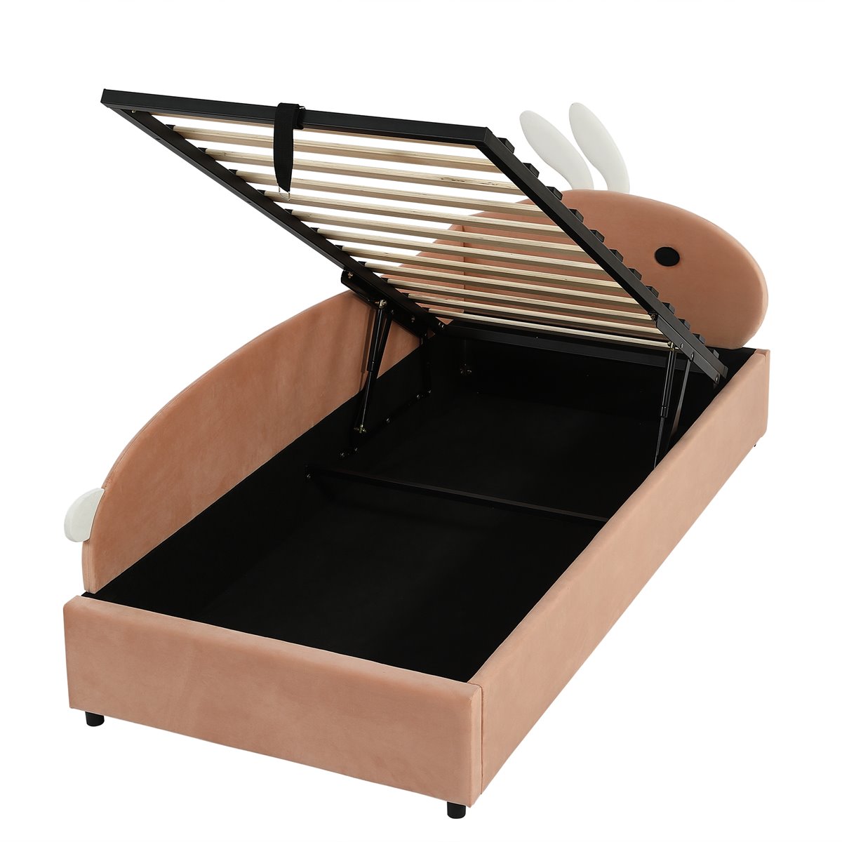 Adorable diseño de conejito: Esta cama infantil tapizada luce un adorable cabecero de conejito que le da un encanto tierno y divertido. Confeccionada en suave terciopelo en una combinación de colores rosa y blanco, irradia calidez y simpatía, perfecta para conquistar el corazón de los niños.