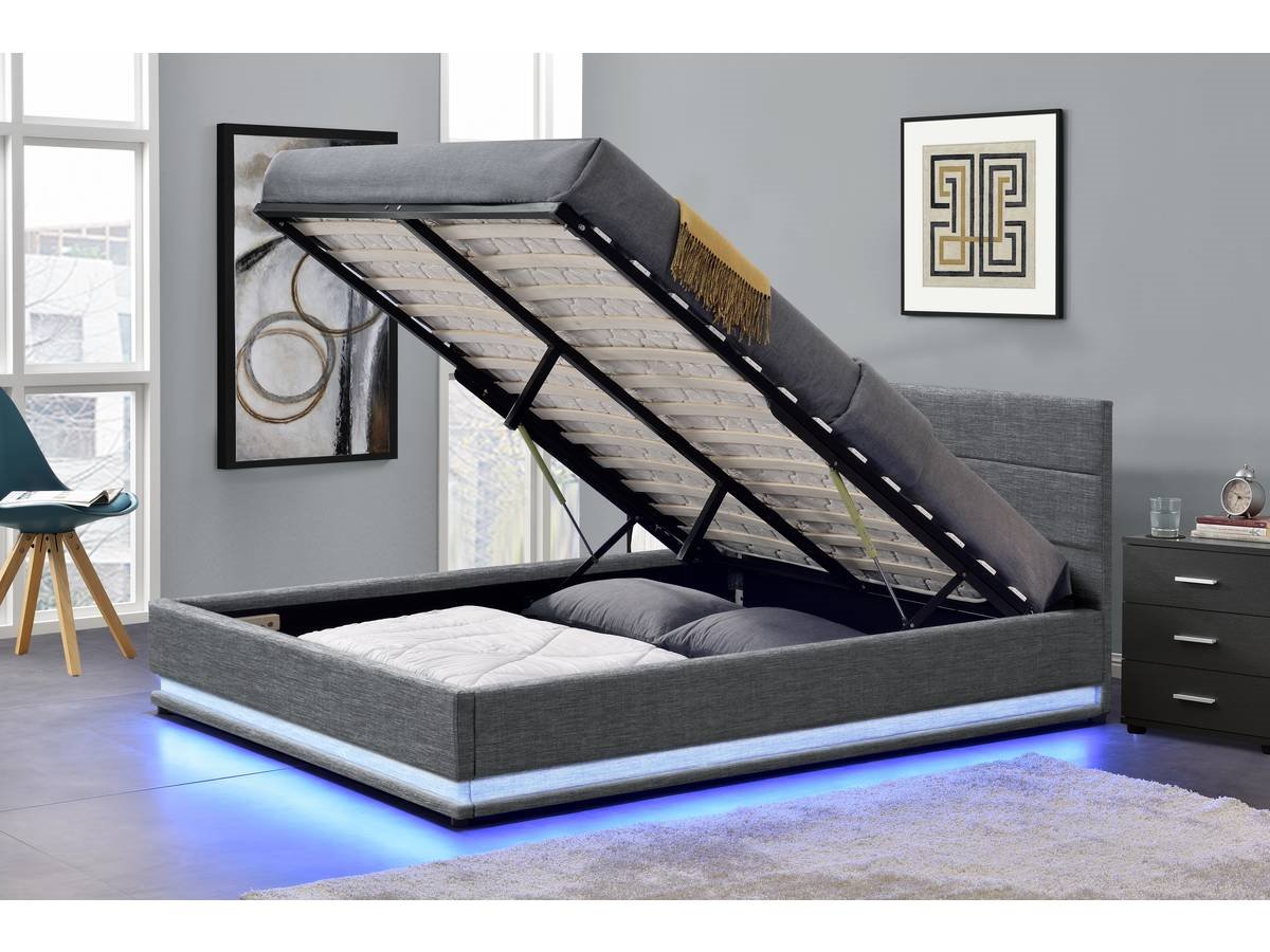 Desripción:- Cama 2 plazas - 160 x 200 cm - Iluminación LED - Cabecero L171 x H90. 5 cm - Soporta hasta 250 kg - Colchón no incluido. Material:MDF y Madera. Acabado:Lino. Dimensiones:171 x 213 x 90. 5 cm. Somier:24 lamas : 75 x 5 x 1 cm - Madera. Cofre:141 x 191 x 23 cm. Patas:3 x 3 x 2. 5 cm - Acero. Peso:67. 5 kg. Embalaje:4 bultos: - 1,75 x 0,09 x 0,9 m, 13,5 kg - 1,93 x 0,06 x 0,35 m, 14 kg - 2,03 x 0,12 x 0,33 m, 25 kg - 1,95 x 0,1 x 0,24 m, 22 kg.