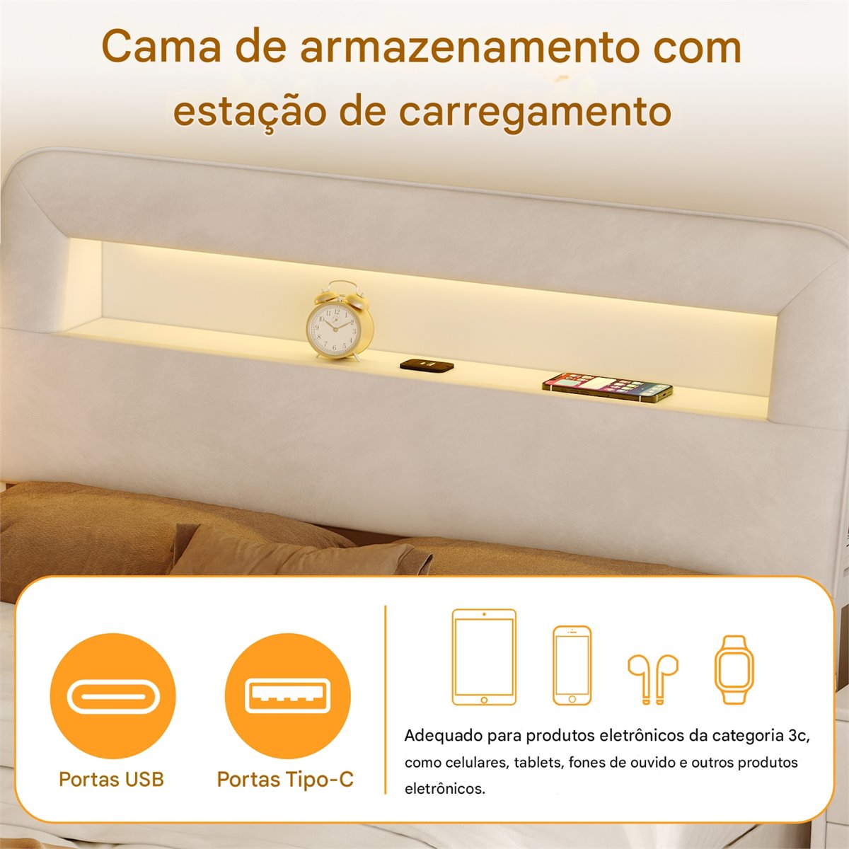Una suave funda de terciopelo color crema crea un ambiente lujoso, mientras que la iluminación LED, los puertos de carga y el espacio de almacenamiento ofrecen una comodidad moderna.