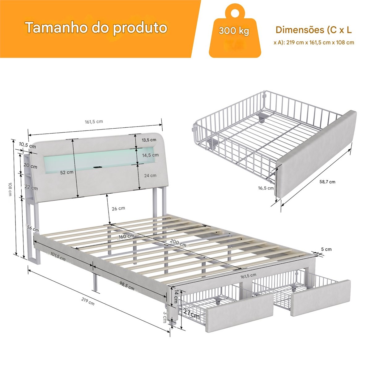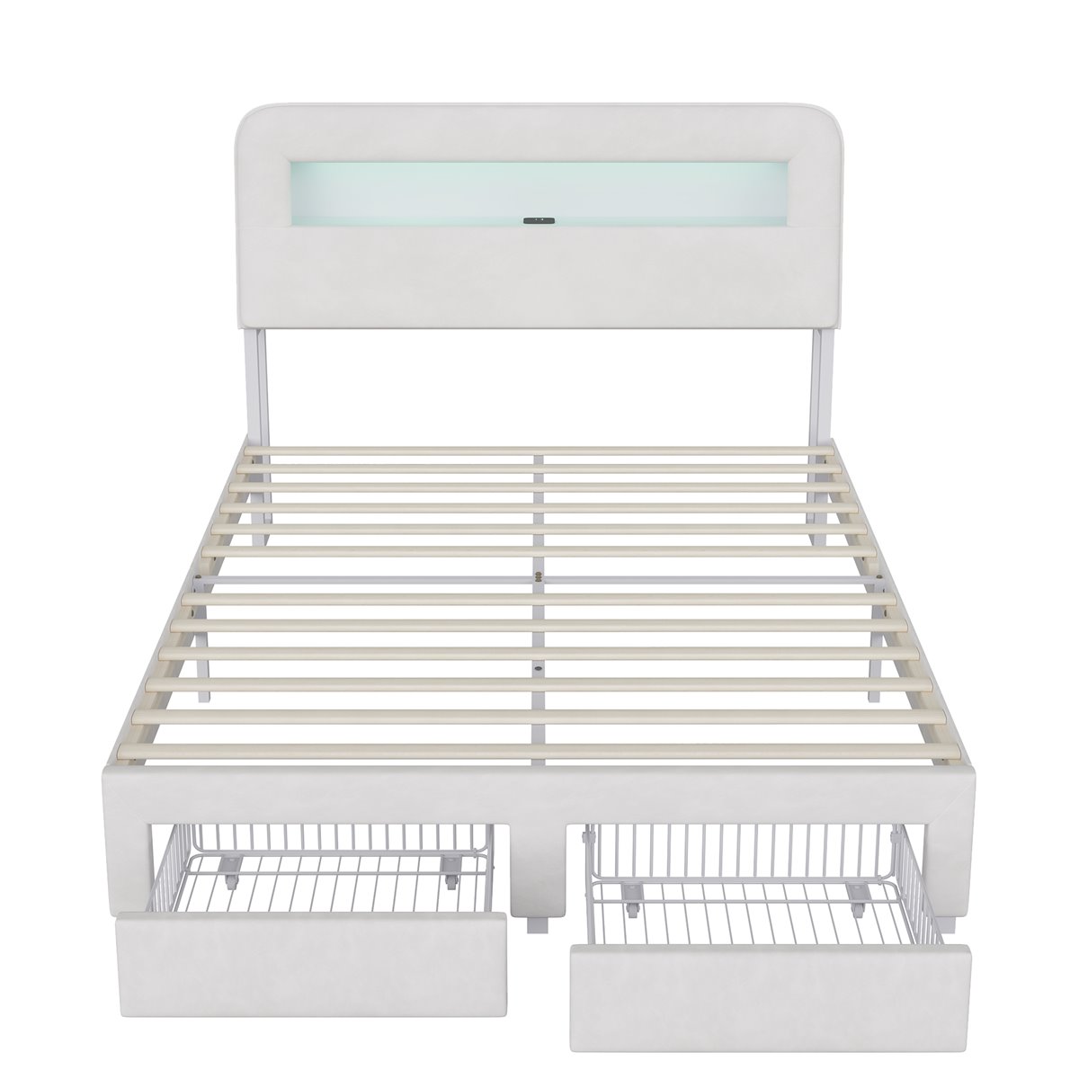 - Cama tapizada (colchón no incluido) con iluminación LED, puerto USB/Tipo C, dos cajones, herrajes de montaje e instrucciones de ensamblaje.