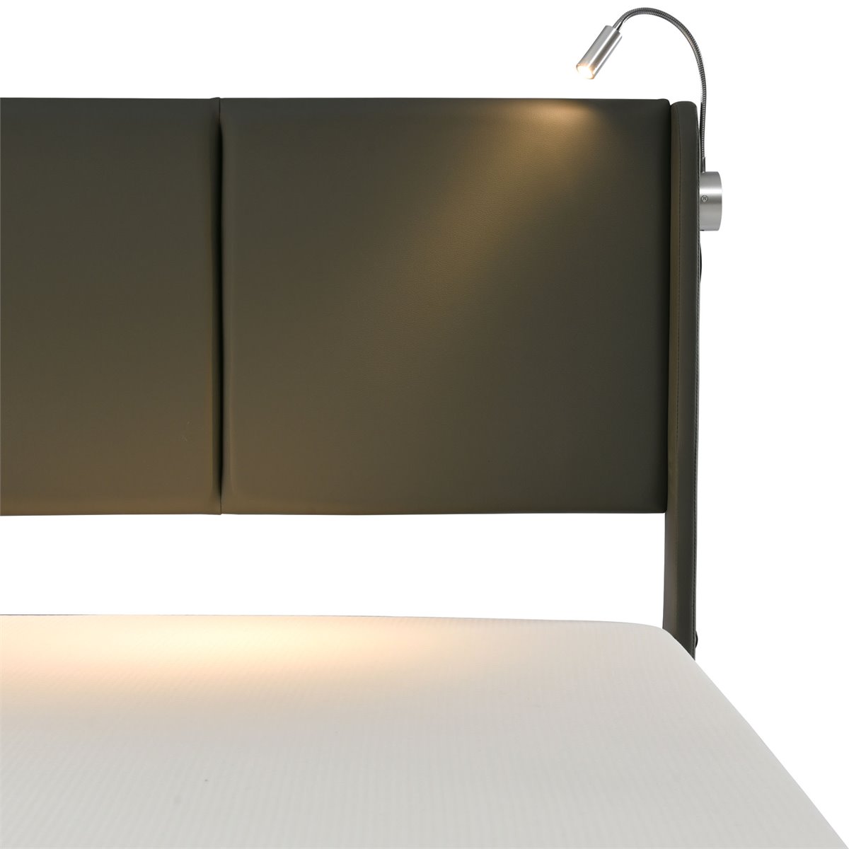 Cabecero con lámpara de lectura: La lámpara de lectura situada en el cabecero de la cama está perfectamente colocada para proporcionar una luz agradable sin molestar a tu pareja. Con su orientación flexible, puedes dirigir la luz exactamente donde la necesitas para poder leer en paz.