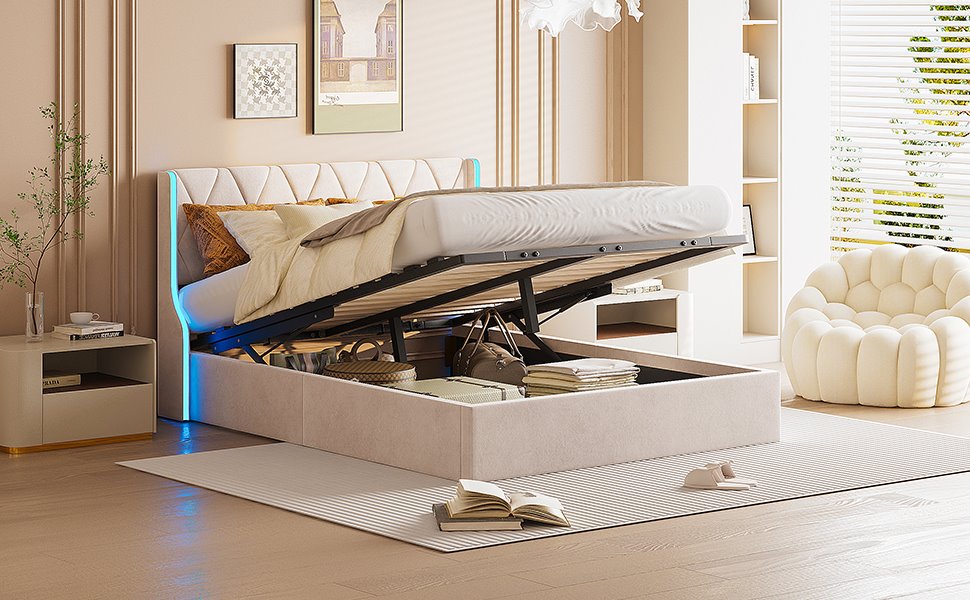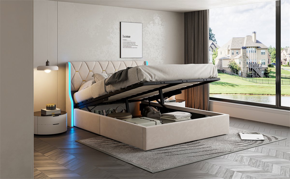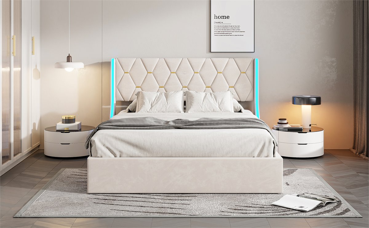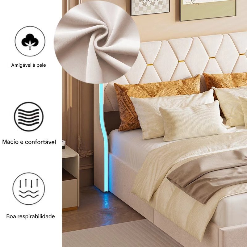 - Una característica especial es la iluminación LED en las alas de la cama, que proporciona una agradable luz indirecta y crea un ambiente relajante. El color beige de esta cama combina a la perfección con diversos estilos de dormitorio, desde modernos hasta clásicos.