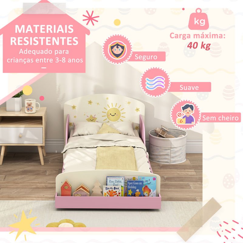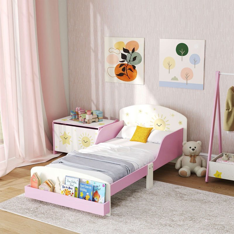 Haz que el paso de la cuna a la cama sea mucho más fácil con esta cama infantil de AIYAPLAY. Su diseño bajo, las barreras laterales y los encantadores detalles en rosa con estrellas te ofrecen seguridad y diversión cada noche. Además, incorpora almacenaje al pie de la cama para que guardes juguetes o cuentos. Fabricada con materiales resistentes, soporta hasta 40 kg y te ayuda a desarrollar autonomía y buenos hábitos de descanso.