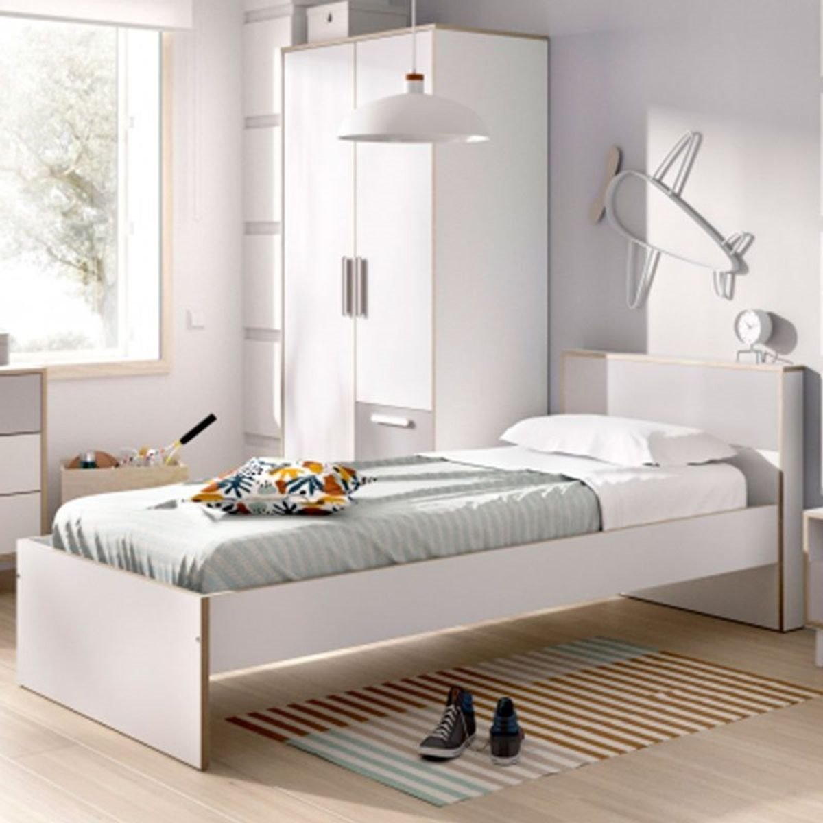 Invierte en el descanso y confort de tus hijos con esta cama juvenil modelo Boreal. Perfecta para niños y adolescentes, esta cama es compatible con colchones de 90 x 190 cm. Está fabricada en melamina de alta calidad y tiene un diseño moderno y elegante combinando el color blanco y gris. Cuenta con un cabecero alto con una repisa sobre la que se pueden depositar pequeños objetos. Además, tiene patas acabadas en ABS, lo que evita ruidos y daños en el suelo. Compra ahora esta resistente cama al mejor precio y verás cómo tus hijos mejoran su descanso y felicidad.