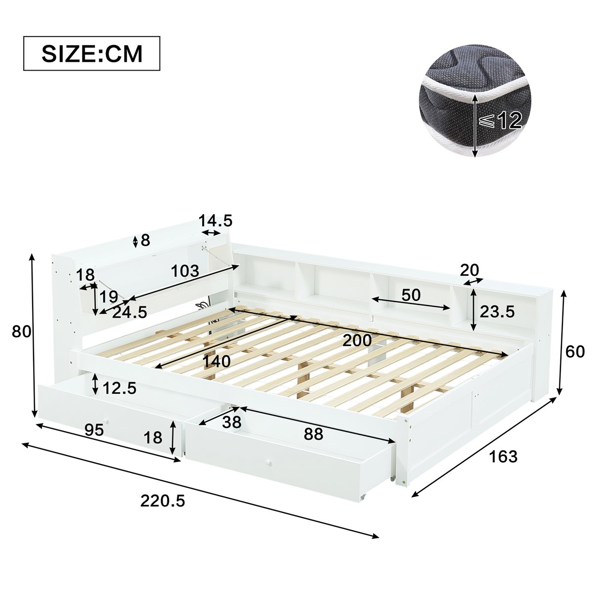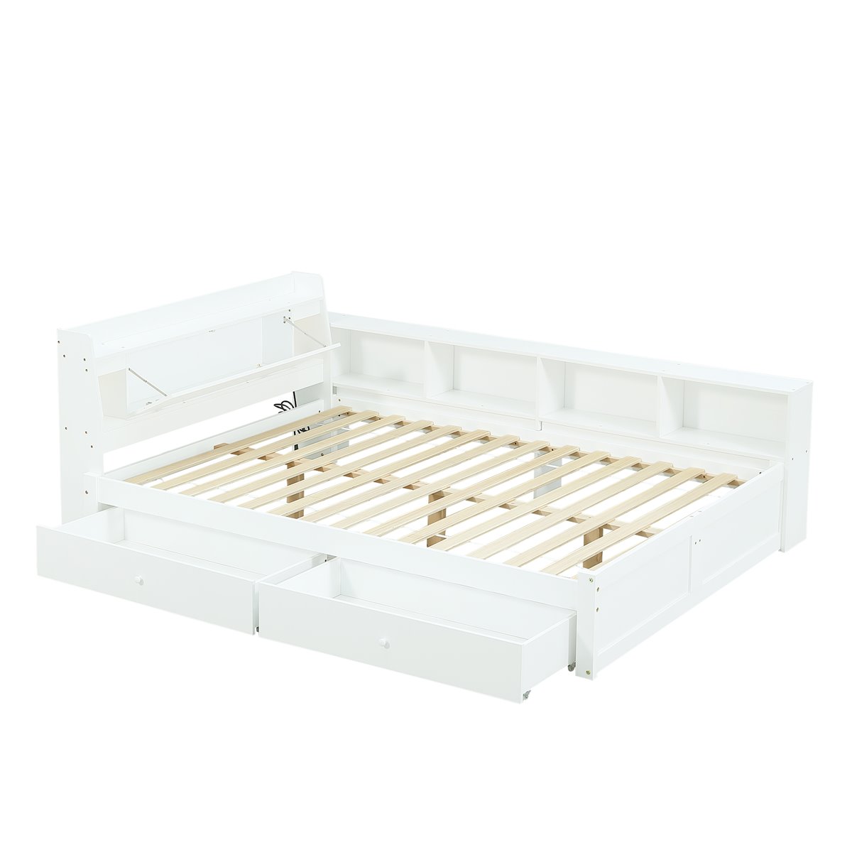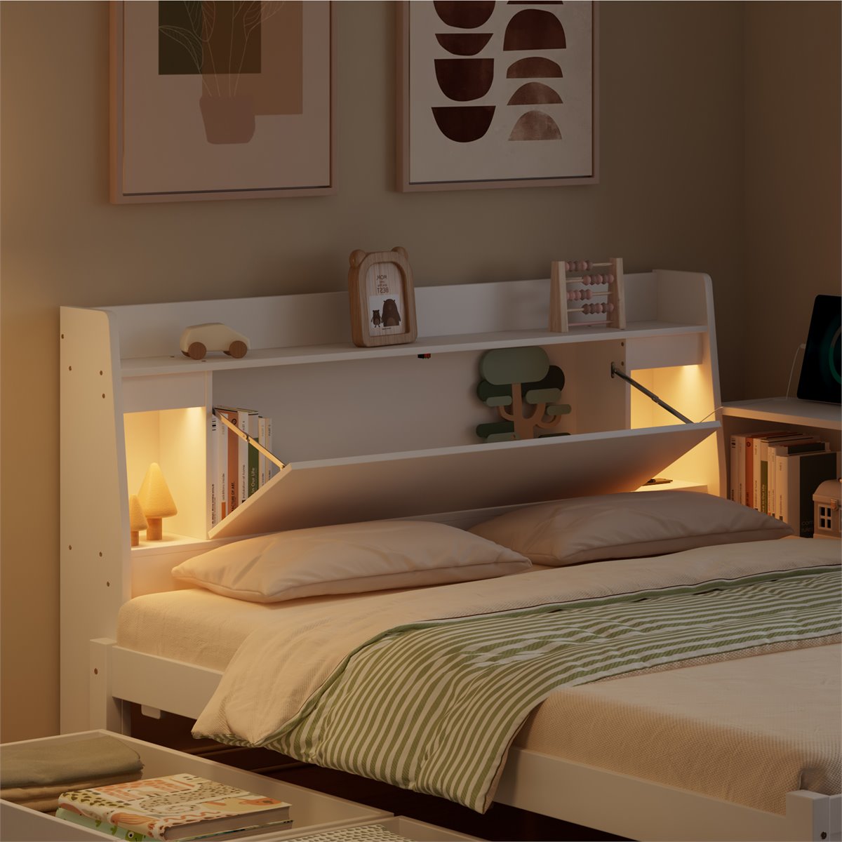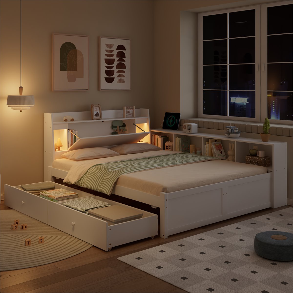 Almacenamiento versátil: El cabecero plegable con dos luces, armarios laterales y dos cajones con ruedas ofrecen un amplio espacio de almacenamiento para organizar tu dormitorio.