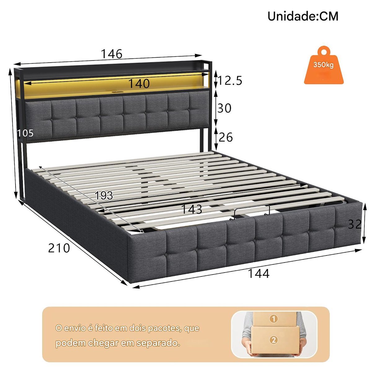 Descripción del producto: 1. Práctico cabecero con cargador integrado: Esta cama está equipada con un cargador USB-C y otro USB para cargar tus dispositivos electrónicos directamente desde el cabecero, lo que te proporciona una comodidad perfecta. 2. Iluminación ambiental con iluminación LED RGB: El cabecero cuenta con iluminación LED RGB dinámica, controlable mediante control remoto o aplicación móvil. Elige entre más de 6000 colores para personalizar el ambiente de tu dormitorio. 3. Espacio de almacenamiento bajo la cama con elevación de gas: Disfruta de un amplio y práctico espacio de almacenamiento gracias a un sistema de elevación de gas que permite un fácil acceso para guardar tus pertenencias. 4. Materiales de lino gris de alta calidad: La tela de lino gris no solo es estética y elegante, sino también duradera y fácil de mantener, lo que proporciona una comodidad adicional. 5. Comodidad y solidez: El cabecero cuenta con espuma de 2 cm de grosor para mayor comodidad. Su robusta estructura está diseñada para soportar hasta 350 kg, lo que garantiza una durabilidad óptima.