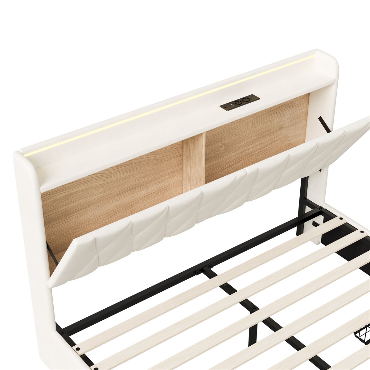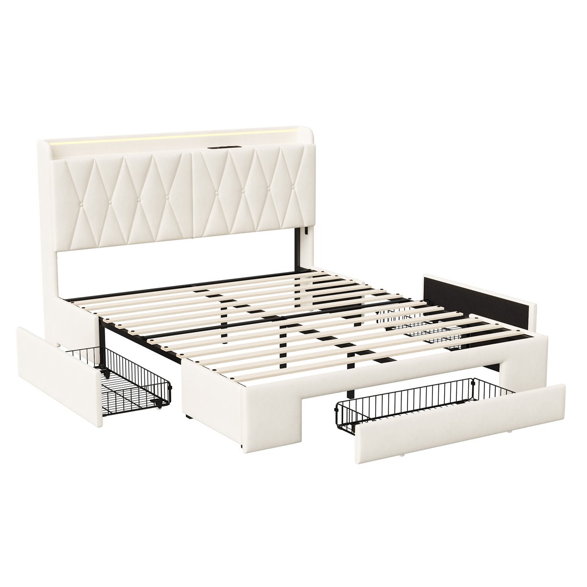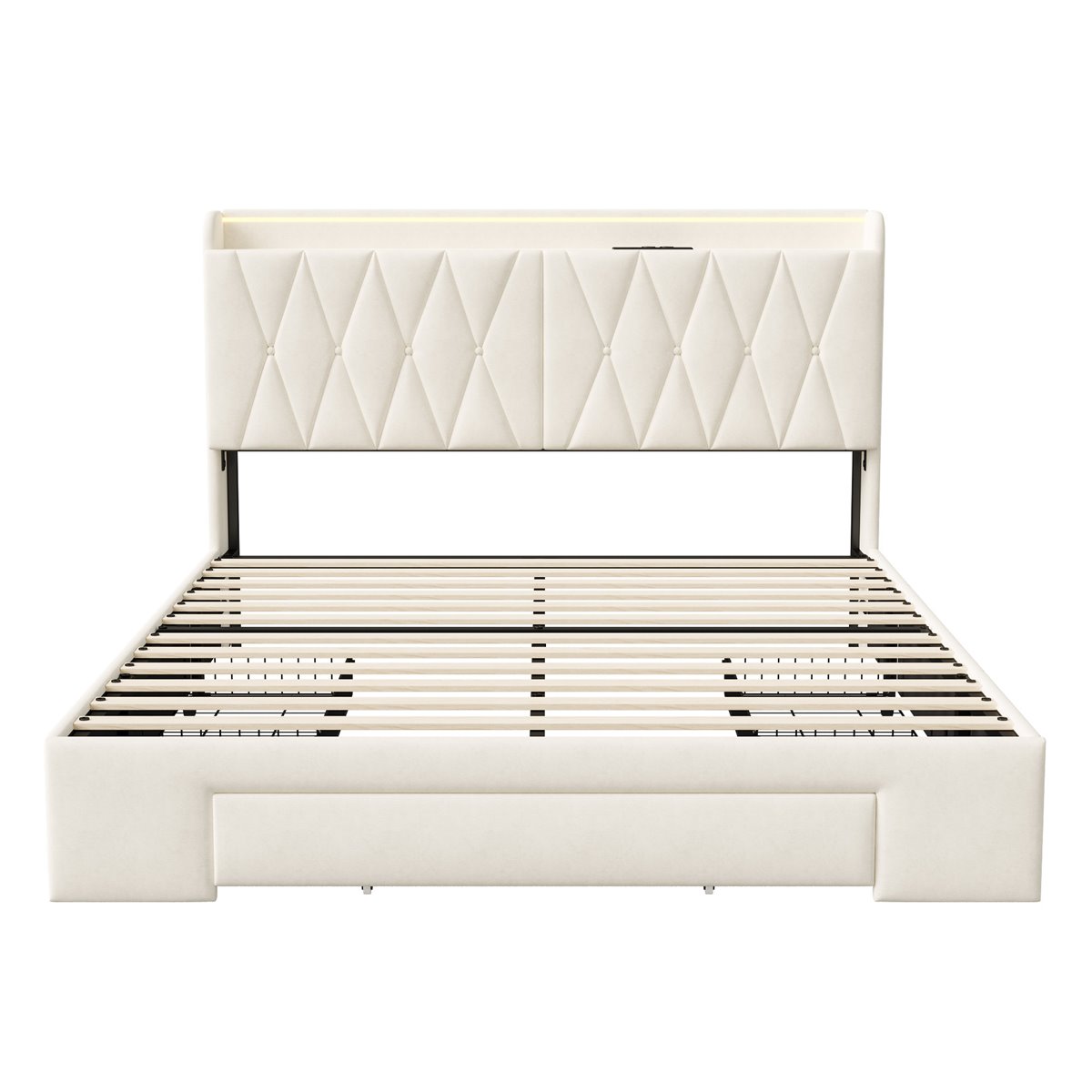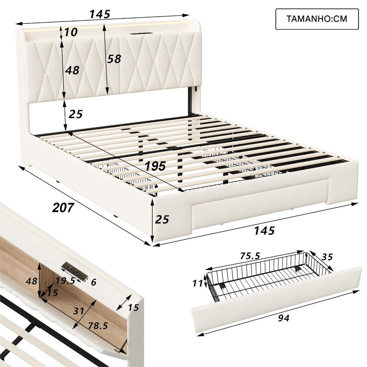 Descripción del producto: 1. Espacio de almacenamiento optimizado: Esta cama cuenta con 3 amplios cajones debajo de la cama y un cajón adicional en la cabecera, perfectos para organizar tus pertenencias y maximizar el espacio. 2. Función de carga integrada: La cabecera cuenta con un puerto USB para cargar cómodamente tus dispositivos electrónicos, mientras que la iluminación LED RGB añade un toque estético y dinámico a tu dormitorio. 3. Diseño moderno y elegante: El patrón simple y elegante de la cabecera y el pie de cama, acompañado de la suave textura del terciopelo beige, aporta comodidad y estilo a tu espacio. 4. Material de primera calidad: Tapicería de terciopelo suave y agradable al tacto, que proporciona una comodidad excepcional y es fácil de mantener. 5. Comodidad y practicidad: Disfruta de la iluminación ajustable y la cómoda carga para un ambiente de descanso más funcional y moderno, a la vez que aportas un ambiente cálido a tu dormitorio.