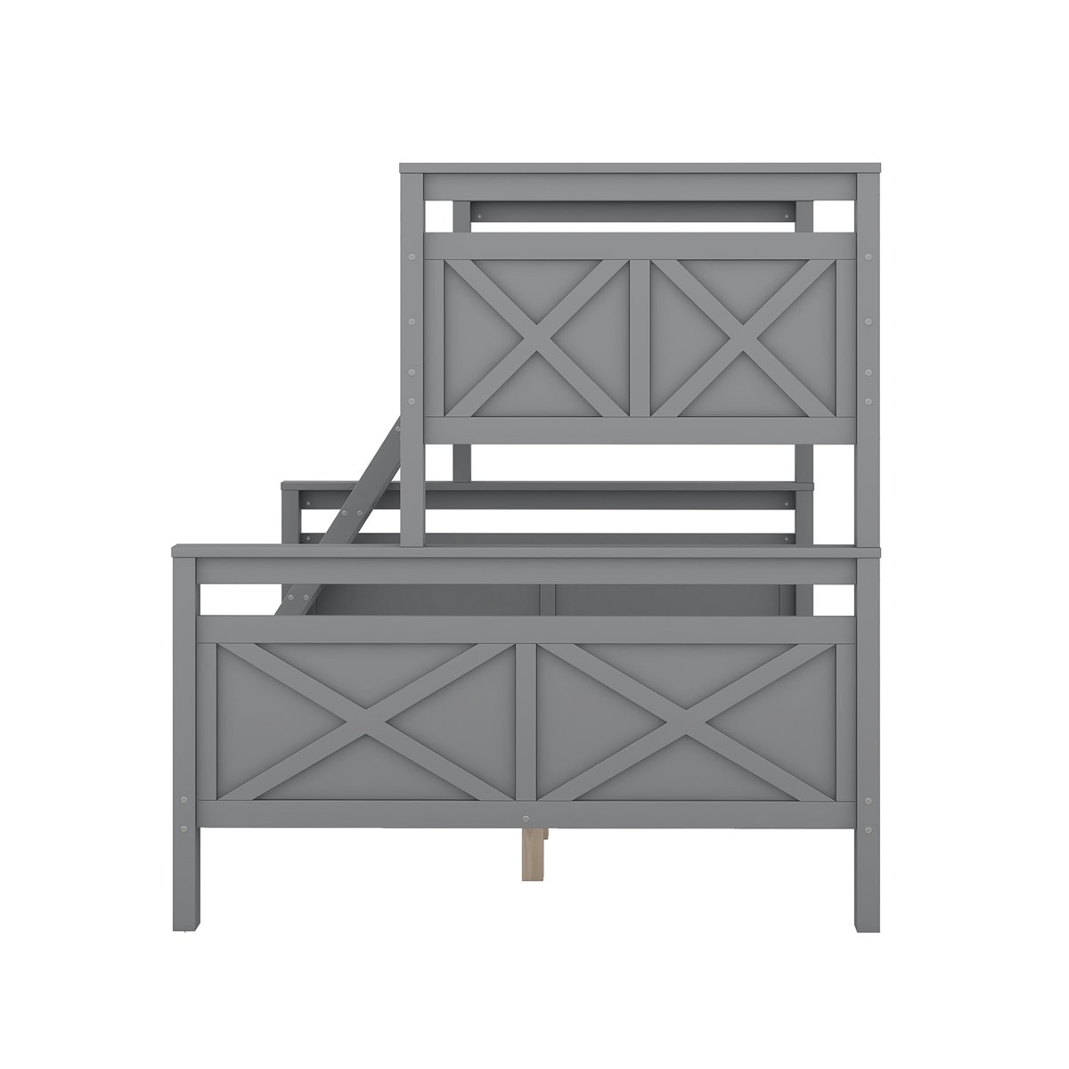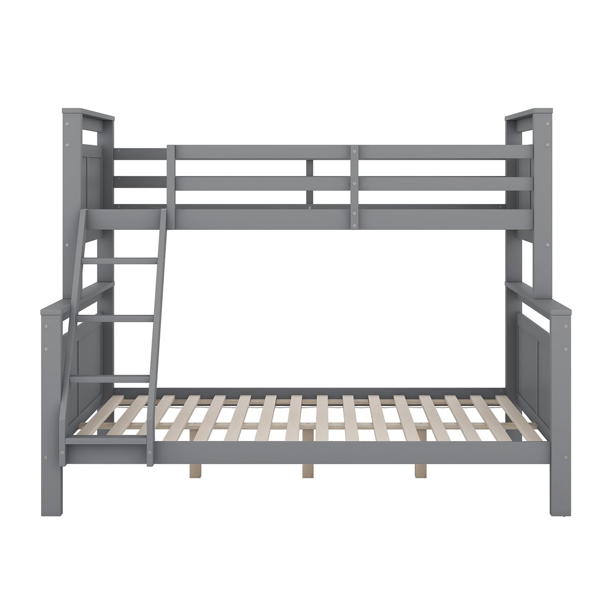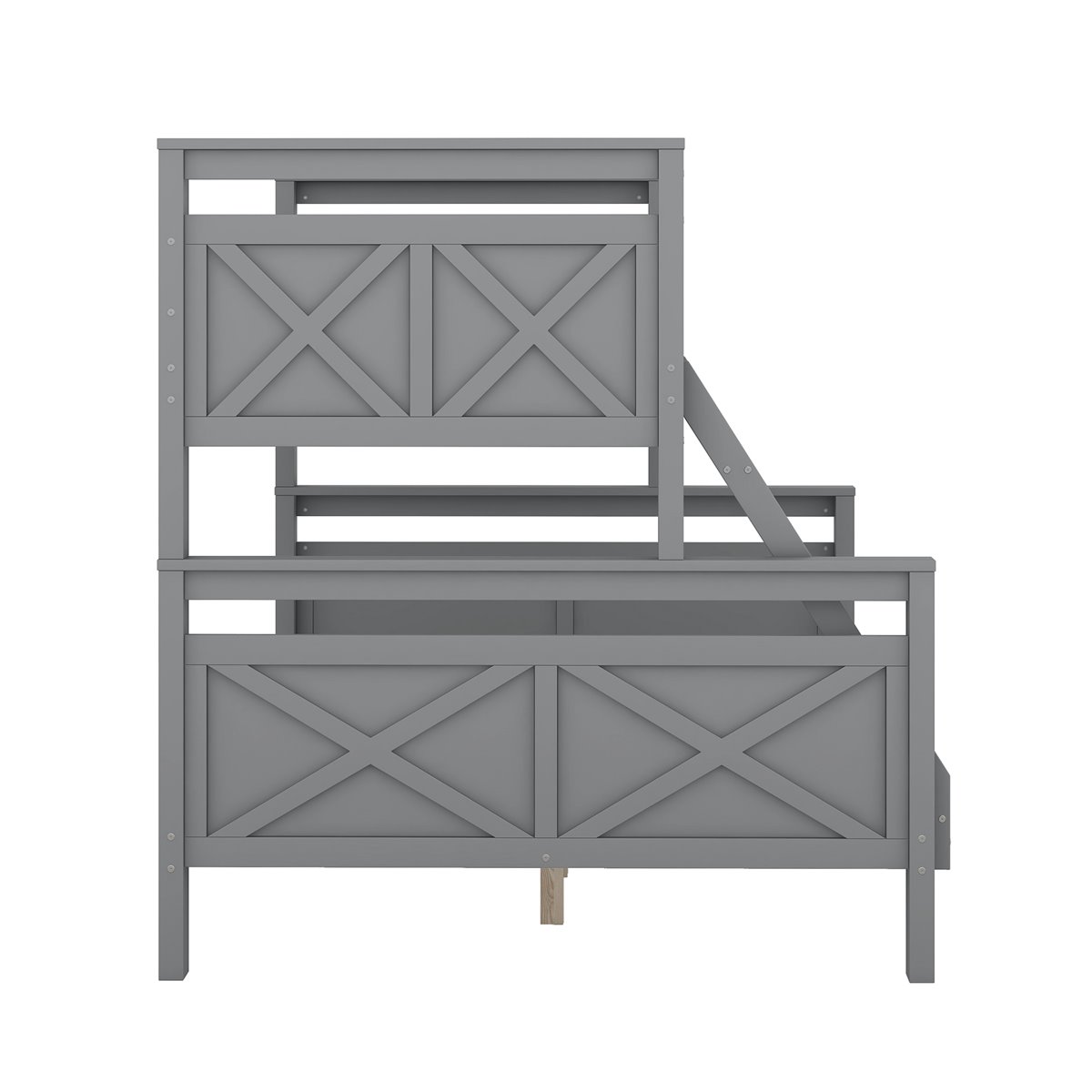 - Litera de madera gris con escalera y barandillas de seguridad, convertible en dos camas separadas.