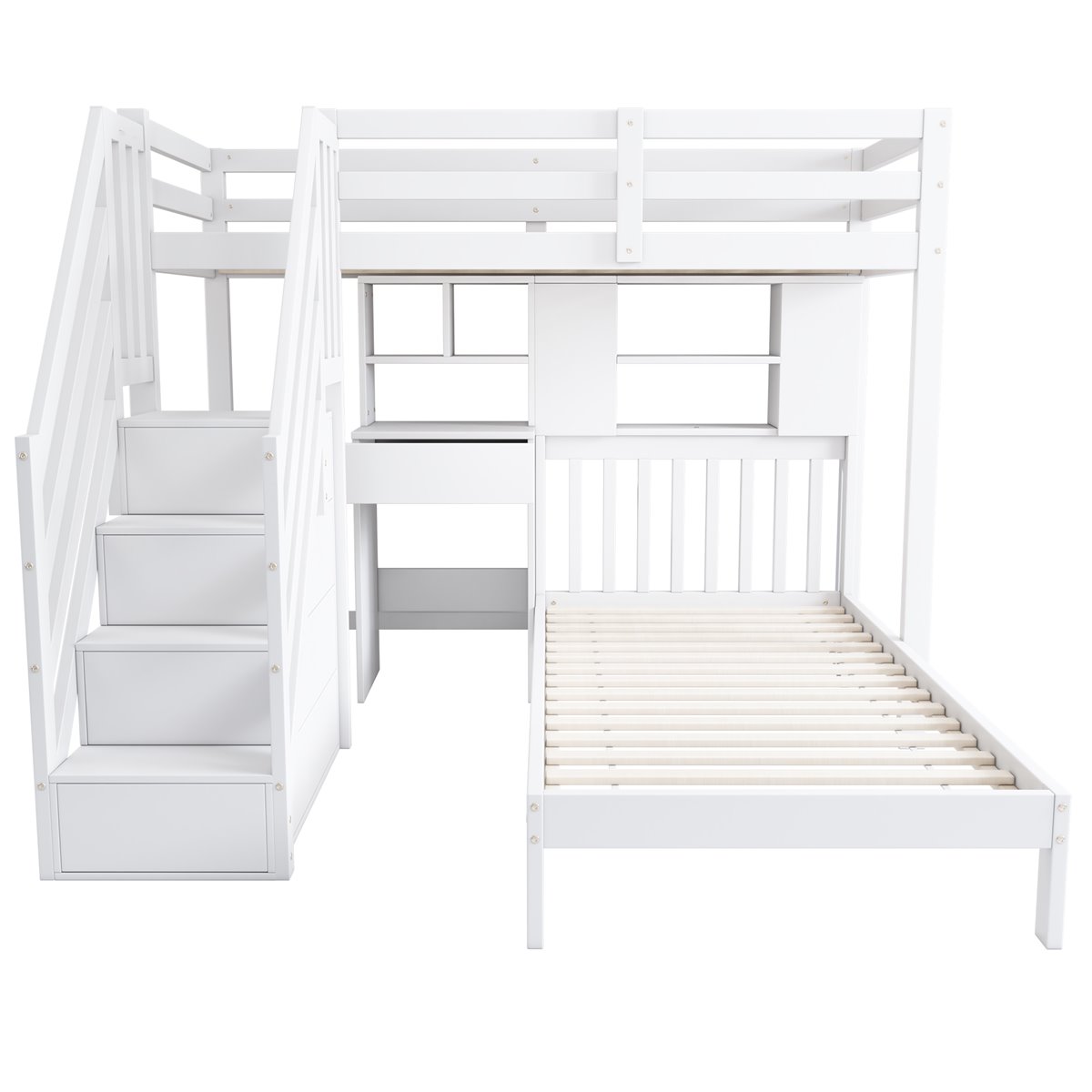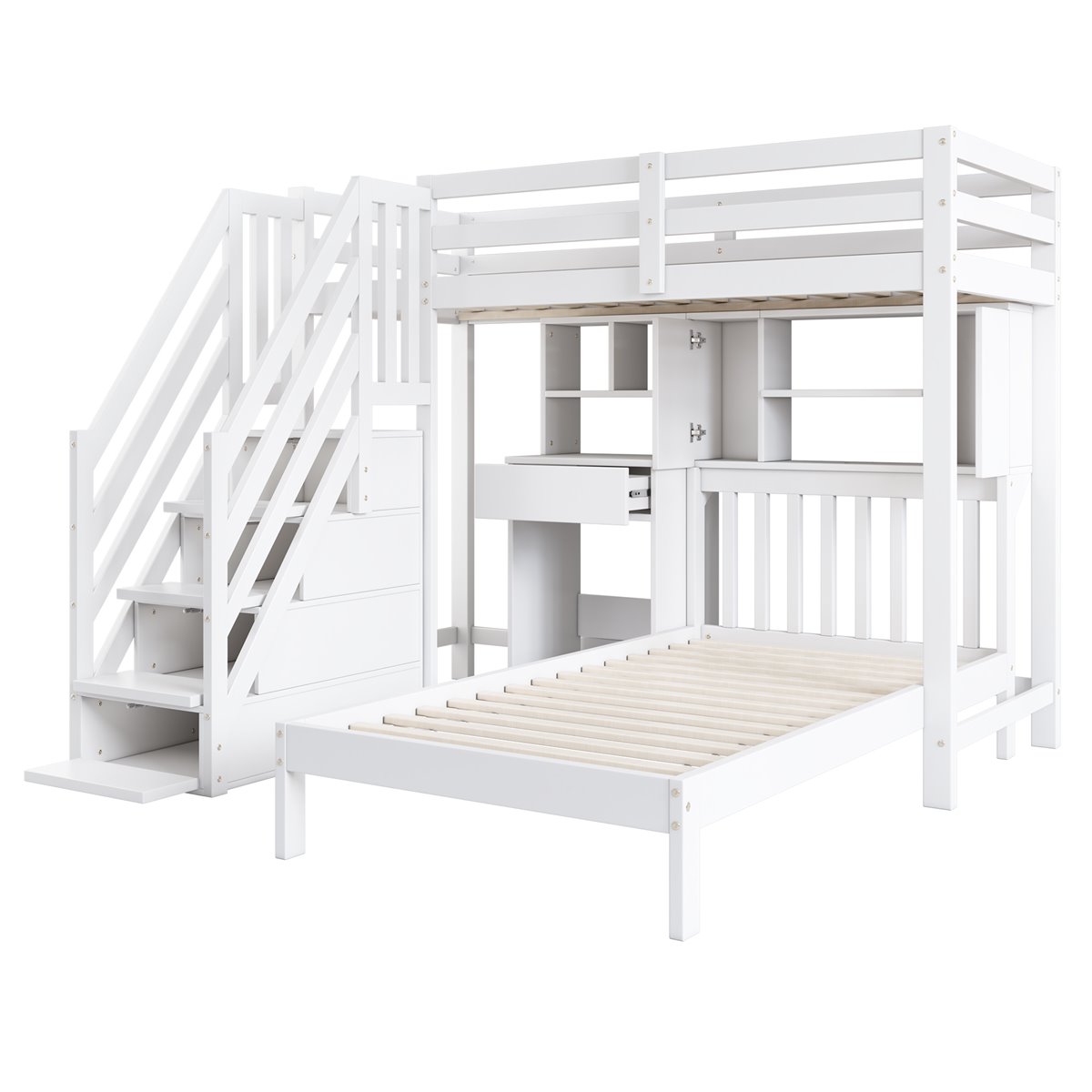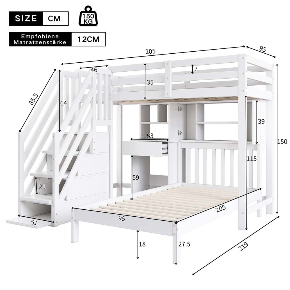 - Escalera con espacio de almacenamiento adicional y estanterías superiores para juguetes, ropa y artículos diversos, manteniendo la habitación ordenada.