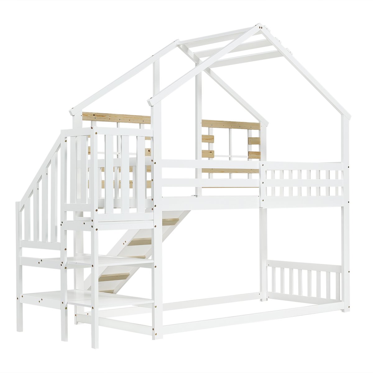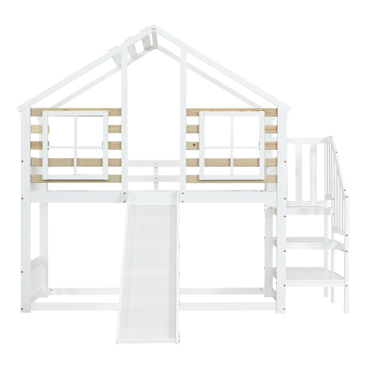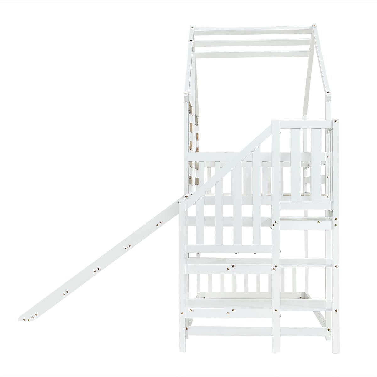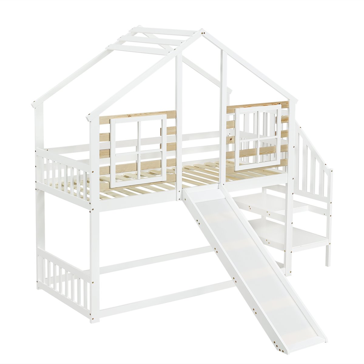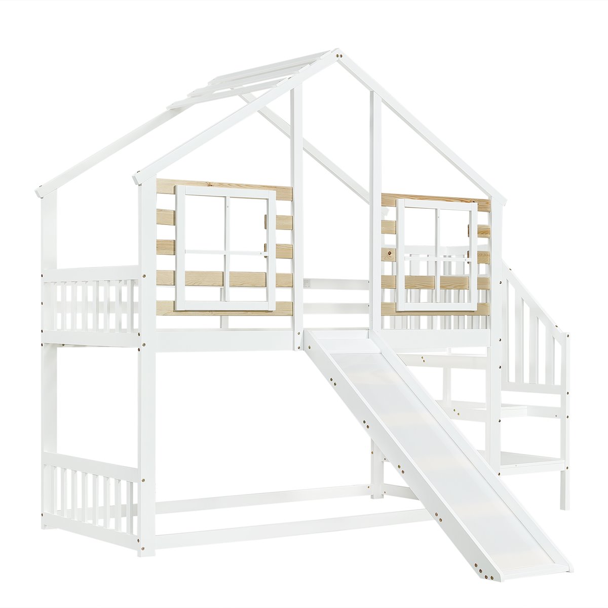 Esta litera de madera con escalera y barandillas ofrece un diseño práctico y divertido para los niños. Equipado con una rampa para deslizarse y dos ventanas en el techo, este "cama casa" fomenta la imaginación y la diversión. La estructura sólida de madera maciza y MDF asegura durabilidad y estabilidad. Además, el espacio debajo de la cama superior no tiene somier, lo que permite aprovechar el área para almacenamiento adicional o colocar un colchón adicional. Con su diseño único, este modelo ofrece un lugar seguro para dormir y jugar.
