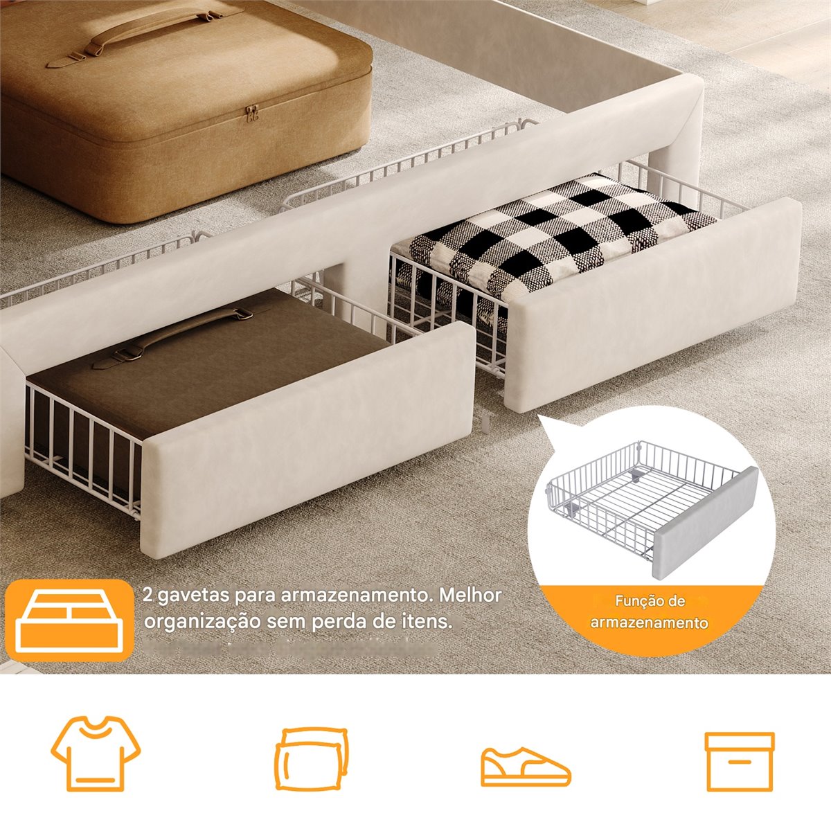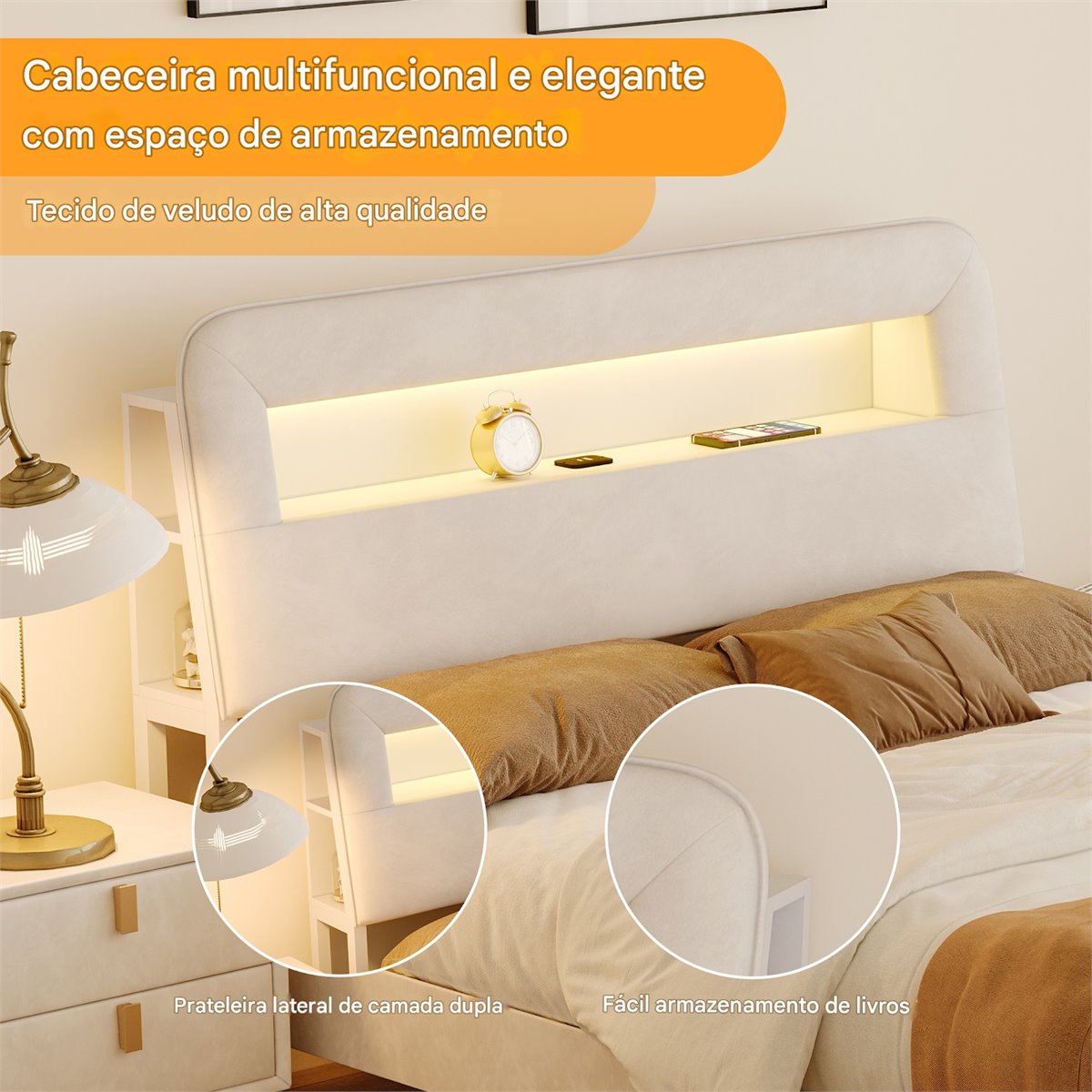 Una suave funda de terciopelo color crema crea un ambiente lujoso, mientras que la iluminación LED, los puertos de carga y el espacio de almacenamiento ofrecen una comodidad moderna.