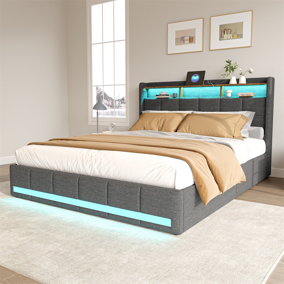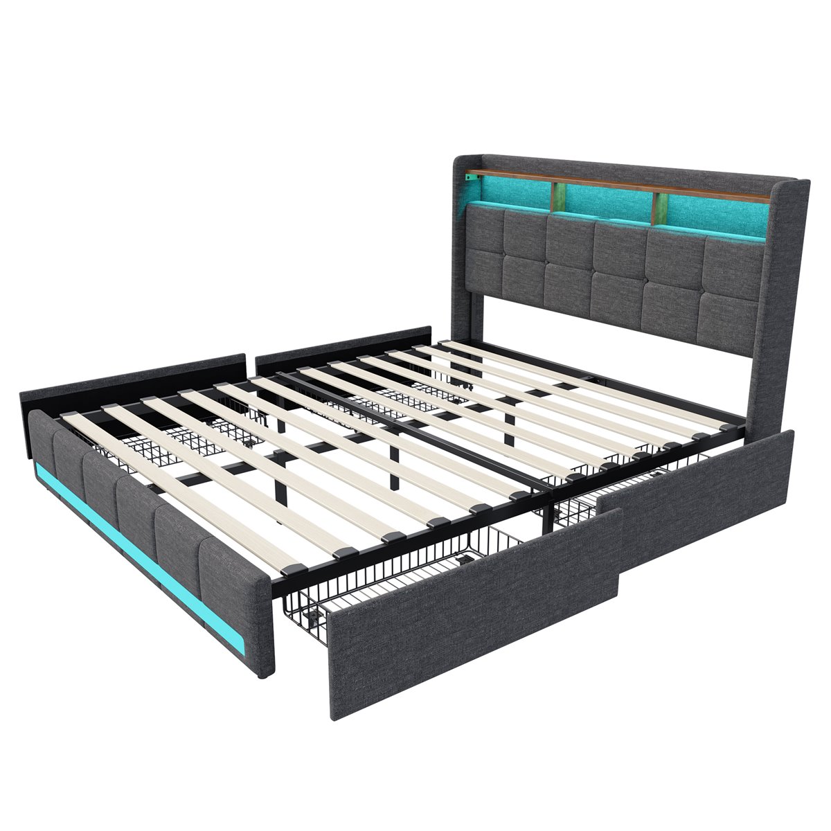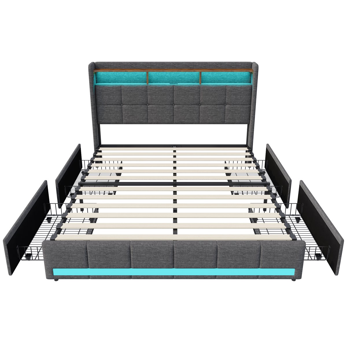Con iluminación LED, puertos USB y USB-C, un compartimento de almacenamiento en el cabecero y cuatro amplios cajones, es la solución perfecta para un dormitorio moderno y organizado.