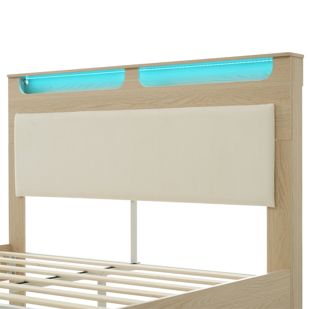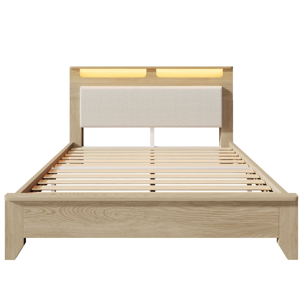 - Diseño Natural y Fresco: Este elegante y moderno cama doble de madera presenta un cabecero tapizado en tela de terciopelo beige, que incluye una niche con luces LED. La estructura de madera de roble clarocomplementa el estilo minimalista y fresco de tu habitación. El cabecero tiene espacio para almacenamiento y decoración, creando un ambiente armonioso y funcional.