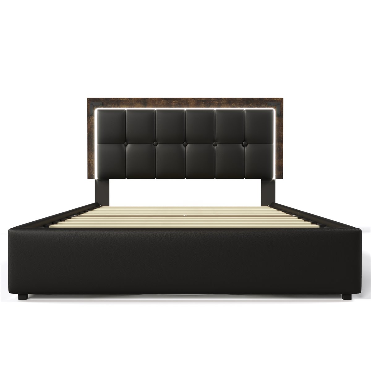 Este elegante y moderno cama tapizada 140x200 cm con LED es ideal para quienes buscan confort y estilo. Con un cabezal ajustable, un diseño de almacenamiento eficiente y una estructura robusta, ofrece un espacio cómodo y organizado para tu dormitorio. El diseño con iluminación LED te permitirá ajustar la intensidad y el color con facilidad, creando el ambiente perfecto. Las cuatro amplias cajoneras permiten almacenar diversos objetos, mientras que la resistente estructura PU negro garantiza durabilidad y estabilidad.