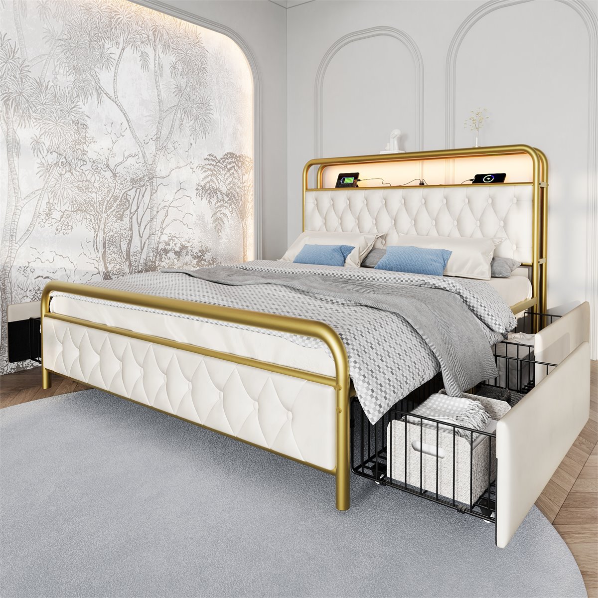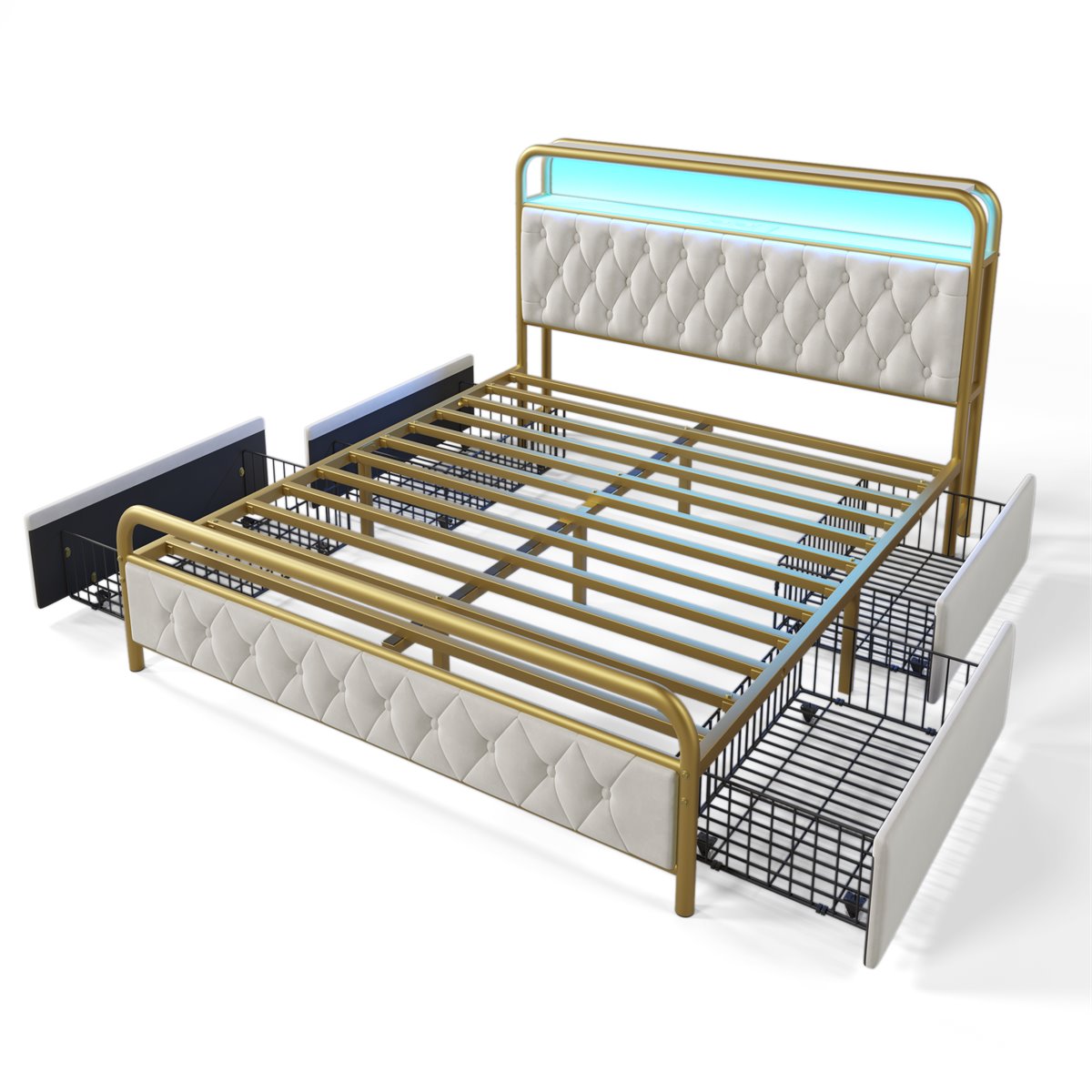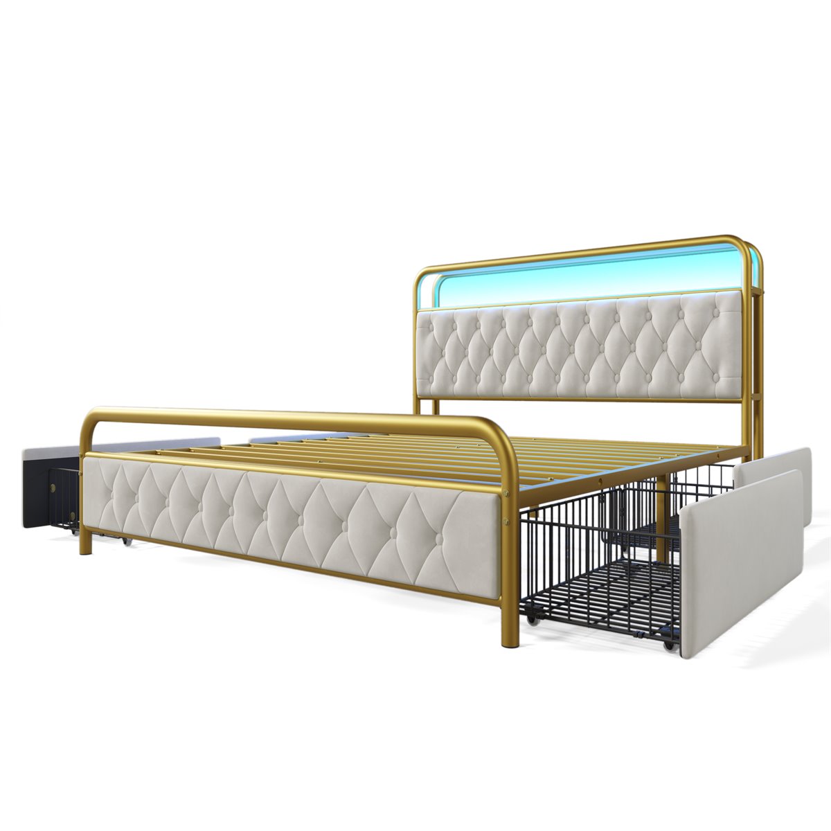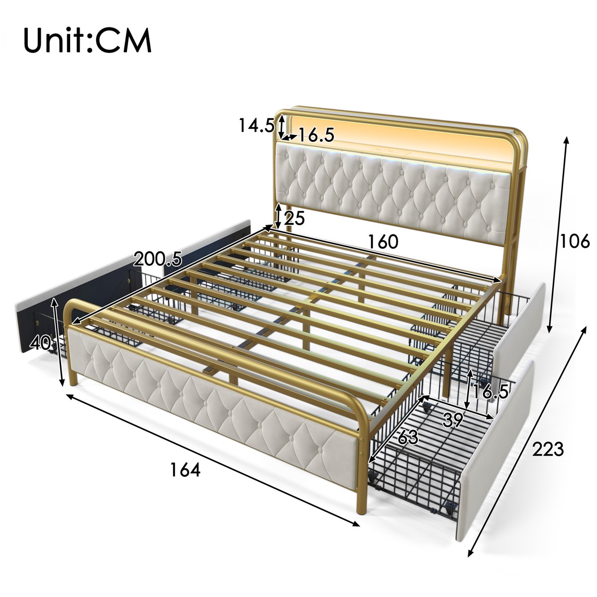 Este elegante cama tapizada de 160x200 cm combina comodidad, funcionalidad y diseño moderno. Su estructura robusta de acero con un acabado de pintura horneada garantiza una larga durabilidad, mientras que el suave terciopelo del cabecero aporta un toque de lujo. Equipado con un sistema de iluminación LED RGB que ofrece 16 colores, modo música y temporizador, este lecho permite crear un ambiente acogedor y personalizado. Además, incluye puertos USB y enchufes para cargar dispositivos fácilmente desde la cama. Las 4 amplias cajoneras ofrecen un almacenamiento adicional ideal para ropa de cama o accesorios fuera de temporada. Perfecto para quienes buscan una cama multifuncional con estilo.