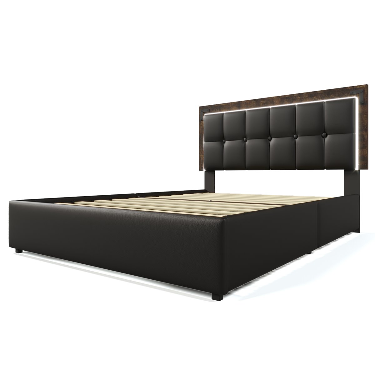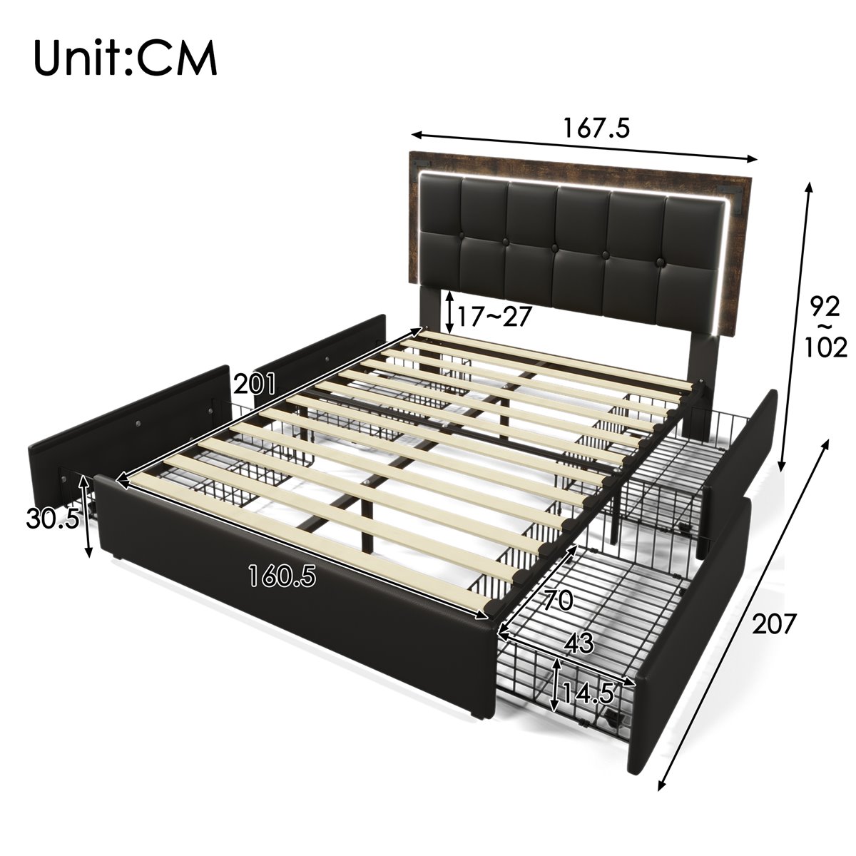 Transforme su dormitorio con esta elegante cama tapizada de 160x200 cm, que incluye una práctica iluminación LED y un diseño funcional con 4 cajones de almacenamiento. El cabezal ajustable y el moderno revestimiento de PU negro proporcionan tanto confort como estilo. La cama viene con una colchón de alta calidad de 720 resortes y dos capas de espuma, ideal para descansar cómodamente. Además, la estructura robusta está diseñada para soportar hasta 300 kg. La funcionalidad de almacenamiento se optimiza con los cajones con ruedas que permiten una fácil extracción y organización.