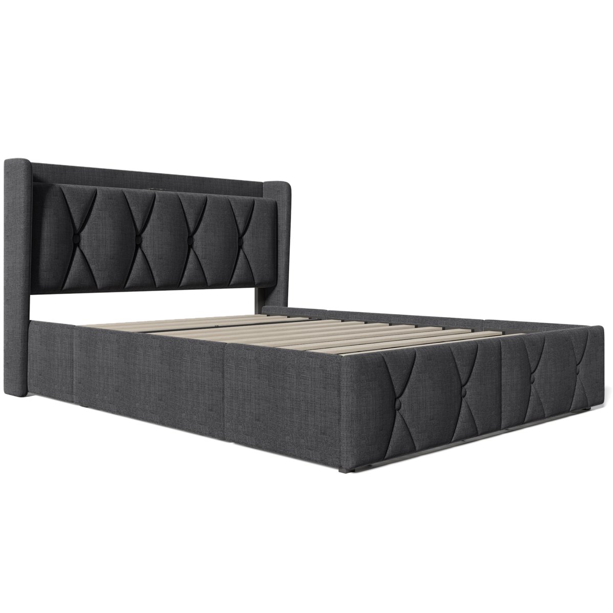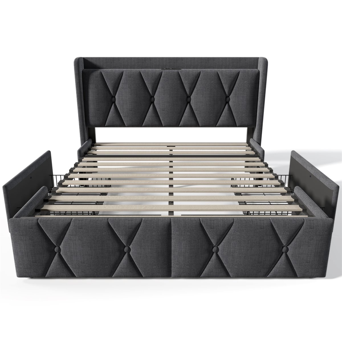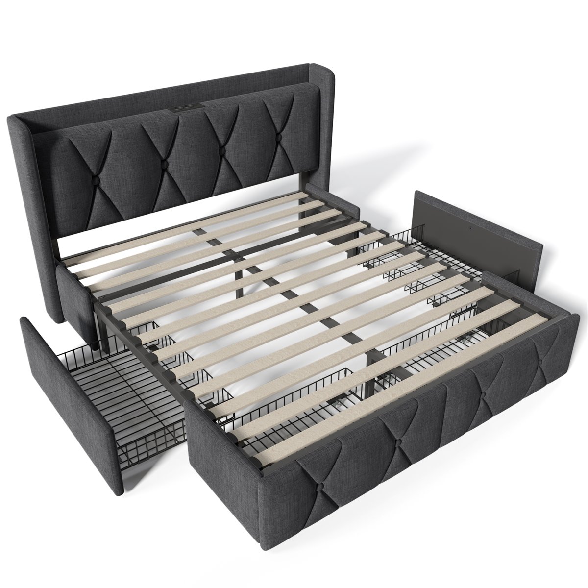 - Cajones: 4 cajones de almacenamiento (2 laterales y 2 en el pie de la cama)