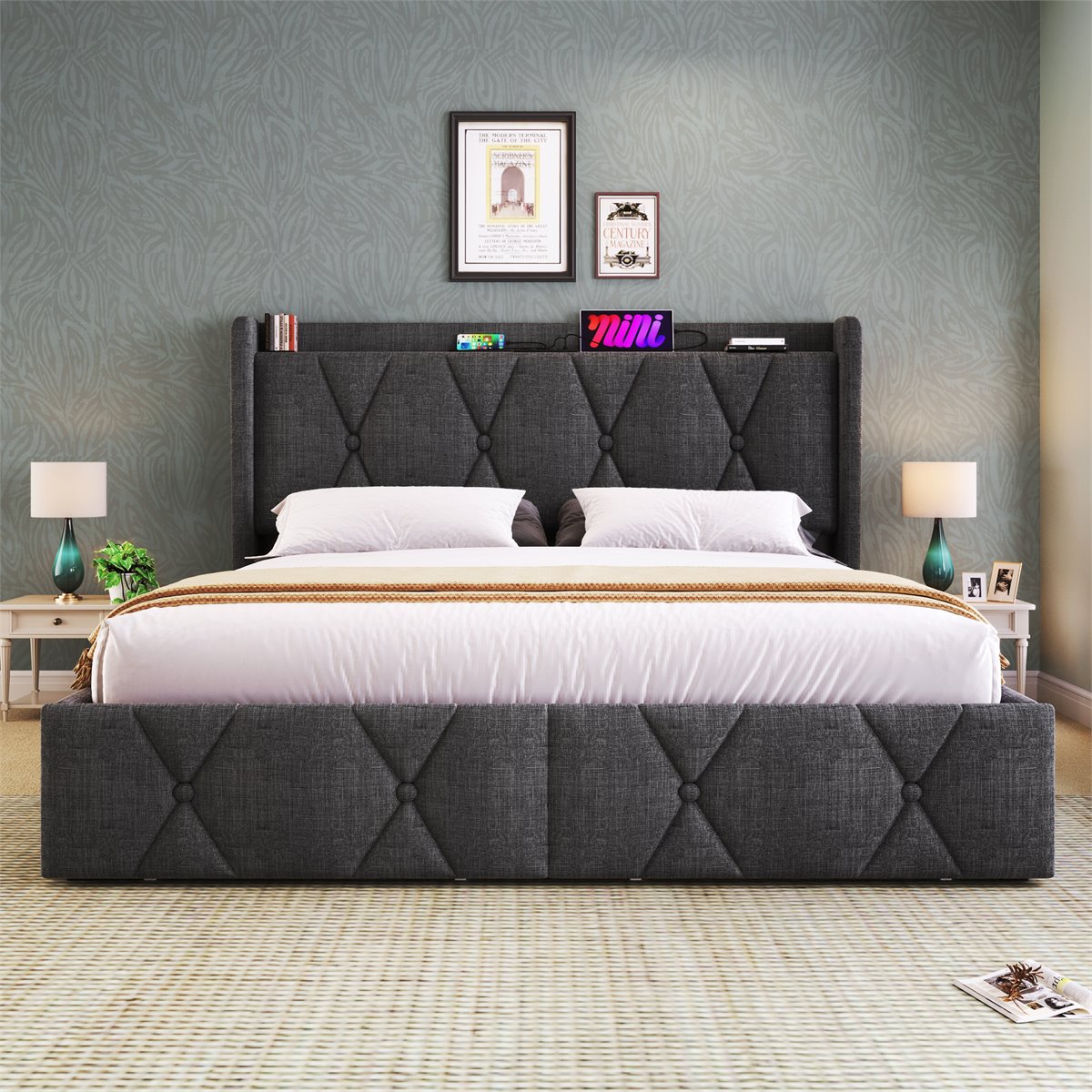 Este elegante cama tapizada de tamaño 160x200 cm combina estilo y funcionalidad, ofreciendo un diseño sofisticado con múltiples características útiles. Con un cabecero acolchado con botones en diamante y una tapicería gris de lino, aporta un toque moderno y cómodo a cualquier habitación. Además, incluye 4 cajones de almacenamiento, lo que optimiza el espacio para almacenar ropa de cama y otros objetos. El cabecero con enchufes y puertos USB integrados proporciona una solución práctica para cargar tus dispositivos electrónicos mientras descansas. La mecedora de espumade 7 zonas de alta calidad está especialmente diseñada para brindarte el soporte adecuado, adaptándose a todos los tipos de durmientes. Es una cama robusta, con una capacidad máxima de 200 kg.