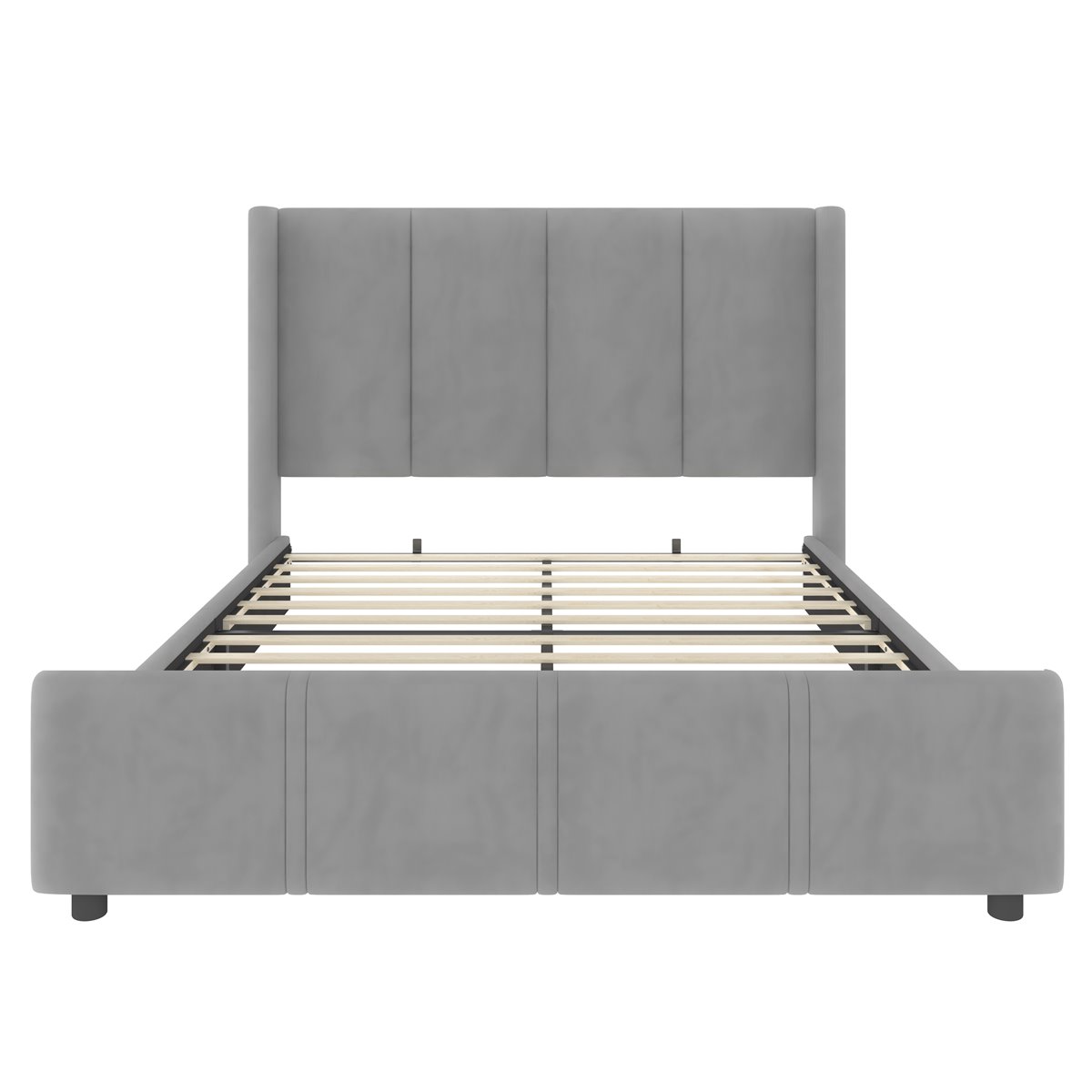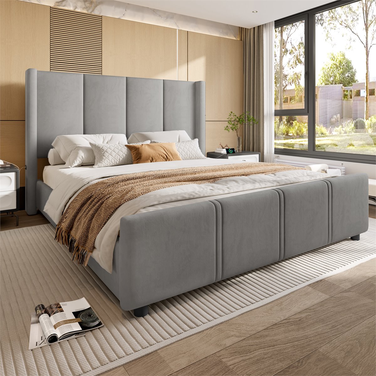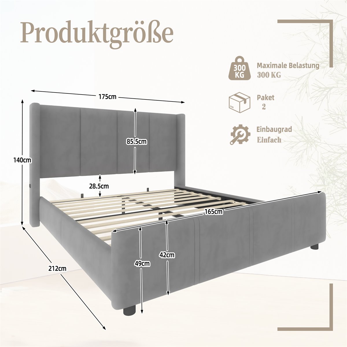 Este elegante marco de cama de 160 x 200 cm, con un diseño moderno y sofisticado, está fabricado con un material de terciopelo suave y duradero, ideal para ofrecer un confort excepcional en su dormitorio. El cabecero alto y el pie de cama proporcionan un soporte óptimo mientras lee o se relaja. Además, está equipado con puertos USB/TYC para cargar dispositivos electrónicos de forma conveniente. Su estructura robusta de combinación de hierro y madera garantiza estabilidad y durabilidad. La tela de terciopelo, en un elegante tono gris, le da un toque de lujo discreto a cualquier decoración de dormitorio, mientras que su diseño simple se adapta perfectamente a estilos modernos y minimalistas.