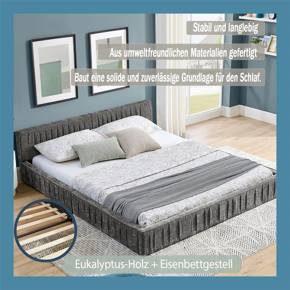 - Material: Tapizado de chenilla suave + estructura robusta de madera de eucalipto ecológica + marco de hierro resistente.