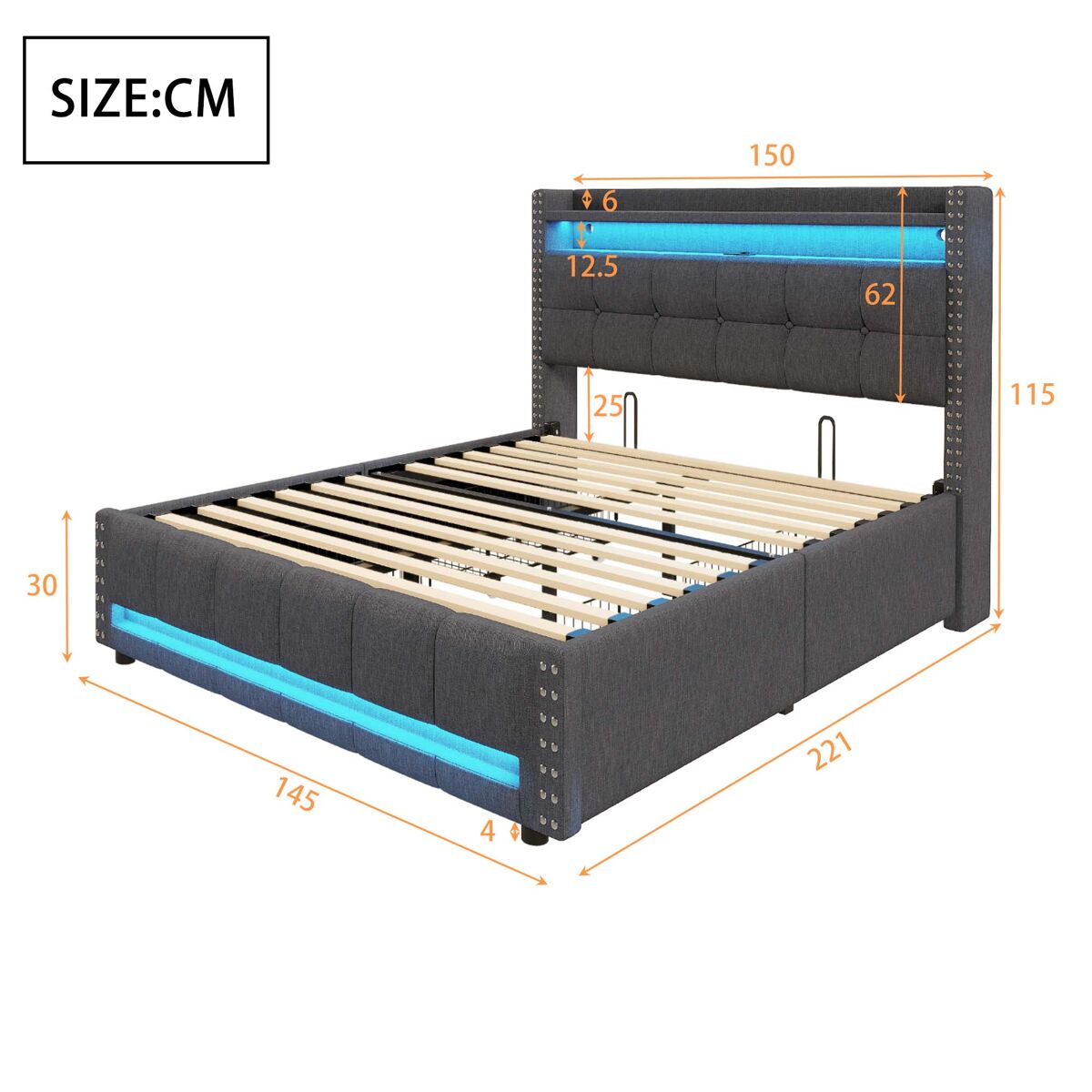 La iluminación LED en la cabecera y el pie de la cama de esta cama tapizada te permite cambiar de color según tu estado de ánimo y tu escena, mejorando así la atmósfera de tu habitación.