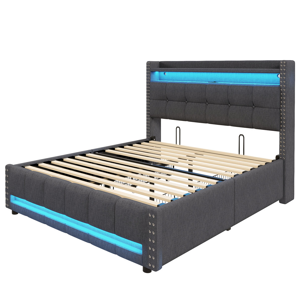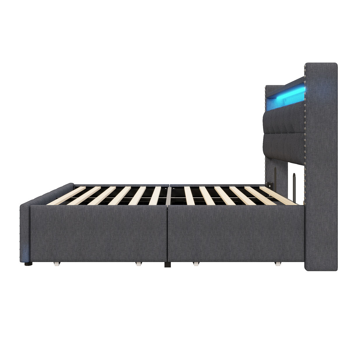Esta cama tapizada para dos personas incluye estanterías y un espacio de almacenamiento en el cabecero para que siempre tengas tus esenciales al alcance de la mano. La toma USB integrada en el cabecero te permite cargar tus dispositivos sin necesidad de cables adicionales. La decoración con remaches en ambos lados del cabecero hace que la cama sea elegante y moderna.