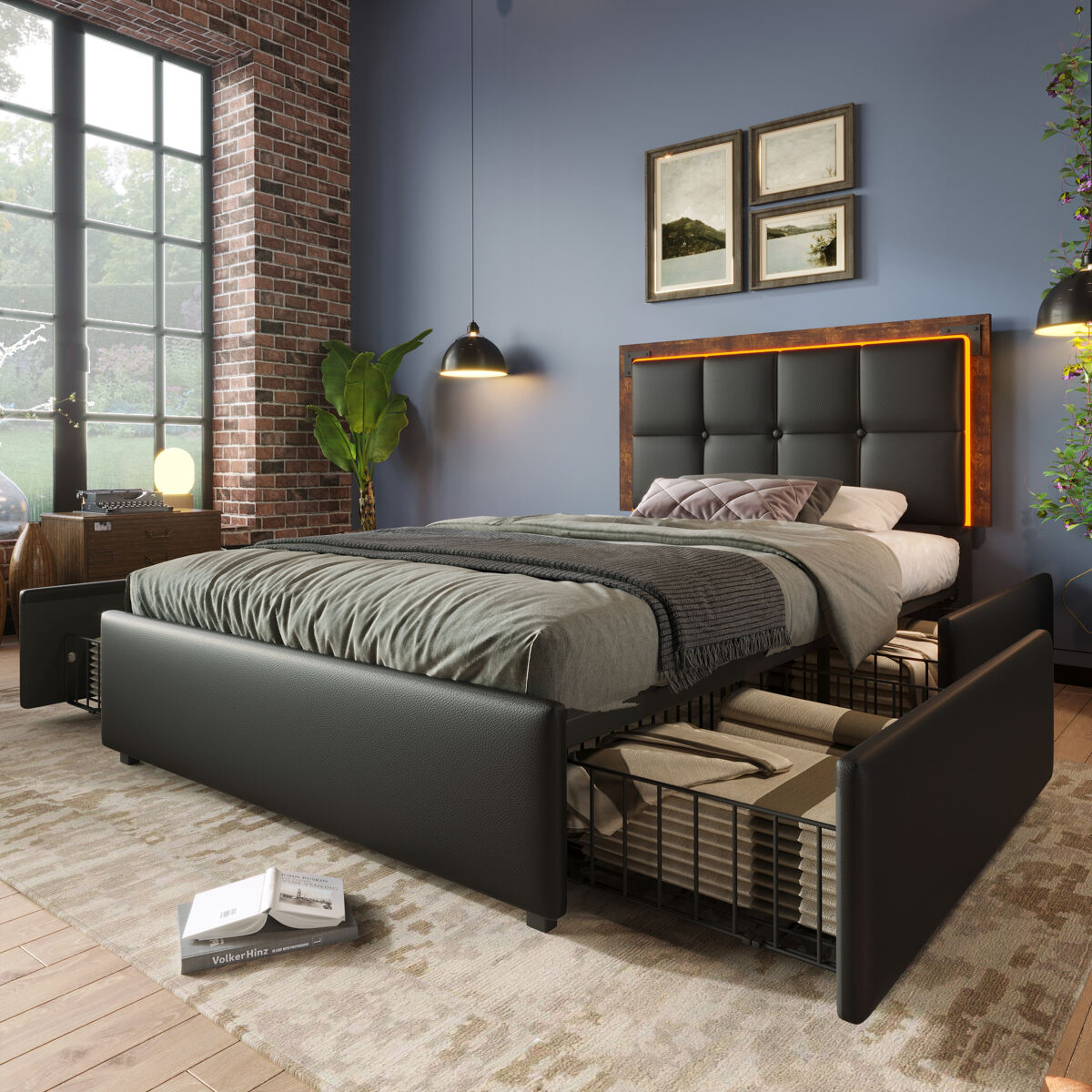 El revestimiento del cabecero está bellamente dividido por un acolchado y cubierto con cuero sintético de alta calidad y lujo. La iluminación LED agrega un estilo moderno a tu habitación. Con el control remoto, puedes cambiar los diferentes colores y el brillo para mayor comodidad.