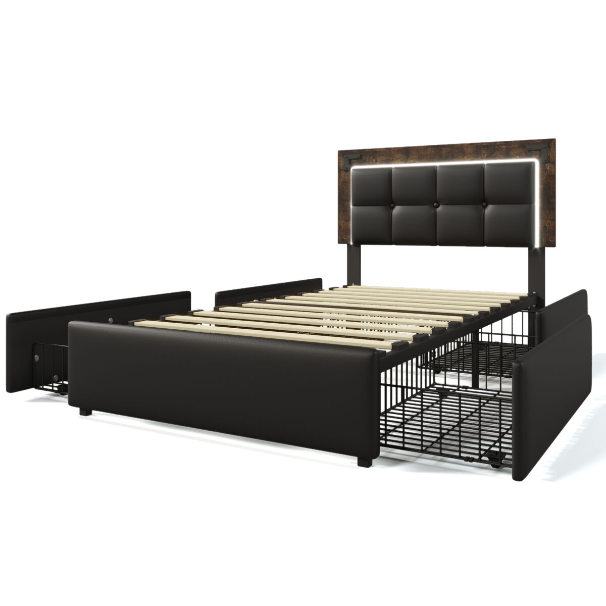 La cama viene con 4 cajones de gran capacidad. Hay pestillos de cajón en ambos lados de la cama para mantener los cajones firmemente en su lugar. El cajón se puede quitar fácilmente gracias a las ruedas en la parte inferior.