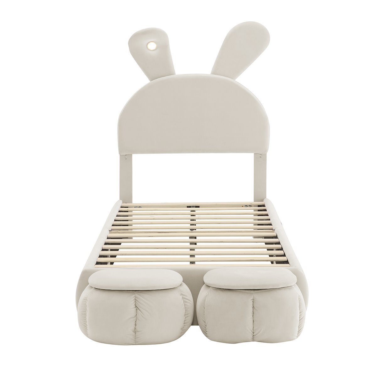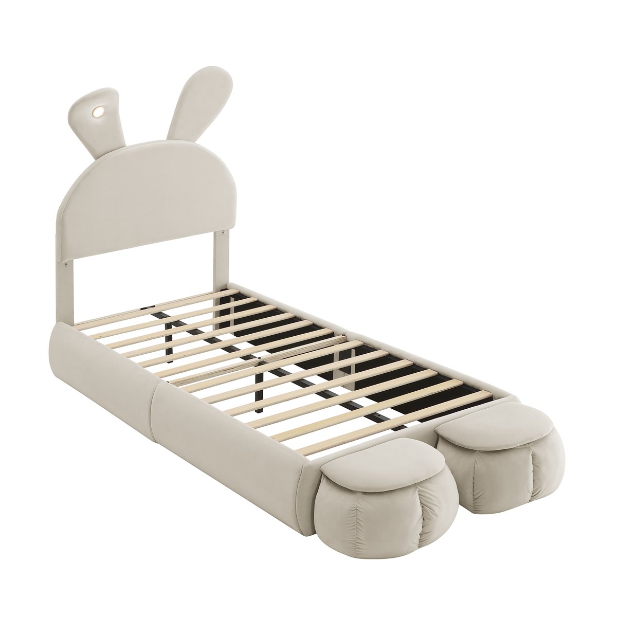 Cama individual 90x200cm - con orejas de conejo, luz cálida regulable, dos taburetes de almacenamiento - Beige