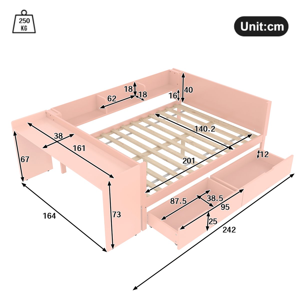 Este elegante y multifuncional cama de madera de 140x200 cm es la opción perfecta para hogares pequeños. Con un diseño compacto que incluye un escritorio integrado, este mueble ahorra espacio mientras ofrece múltiples funciones para el día a día. Las dos amplias cajones bajo la cama permiten guardar ropa, libros y objetos personales, manteniendo el dormitorio organizado y libre de desorden. Los tres estantes adicionales proporcionan espacio adicional para libros, decoraciones o electrónicos. Además, su estructura de madera de pino combinada con tablero de partículas garantiza una durabilidad excepcional.