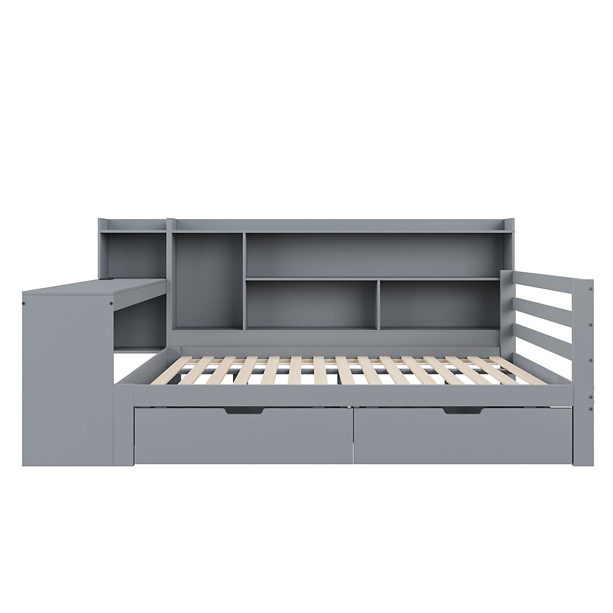 - Diseño multifuncional: Este sofá cama incluye un escritorio integrado, estanterías, un librero, cajones y compartimentos de almacenamiento, ofreciendo un espacio cómodo para dormir y trabajar.