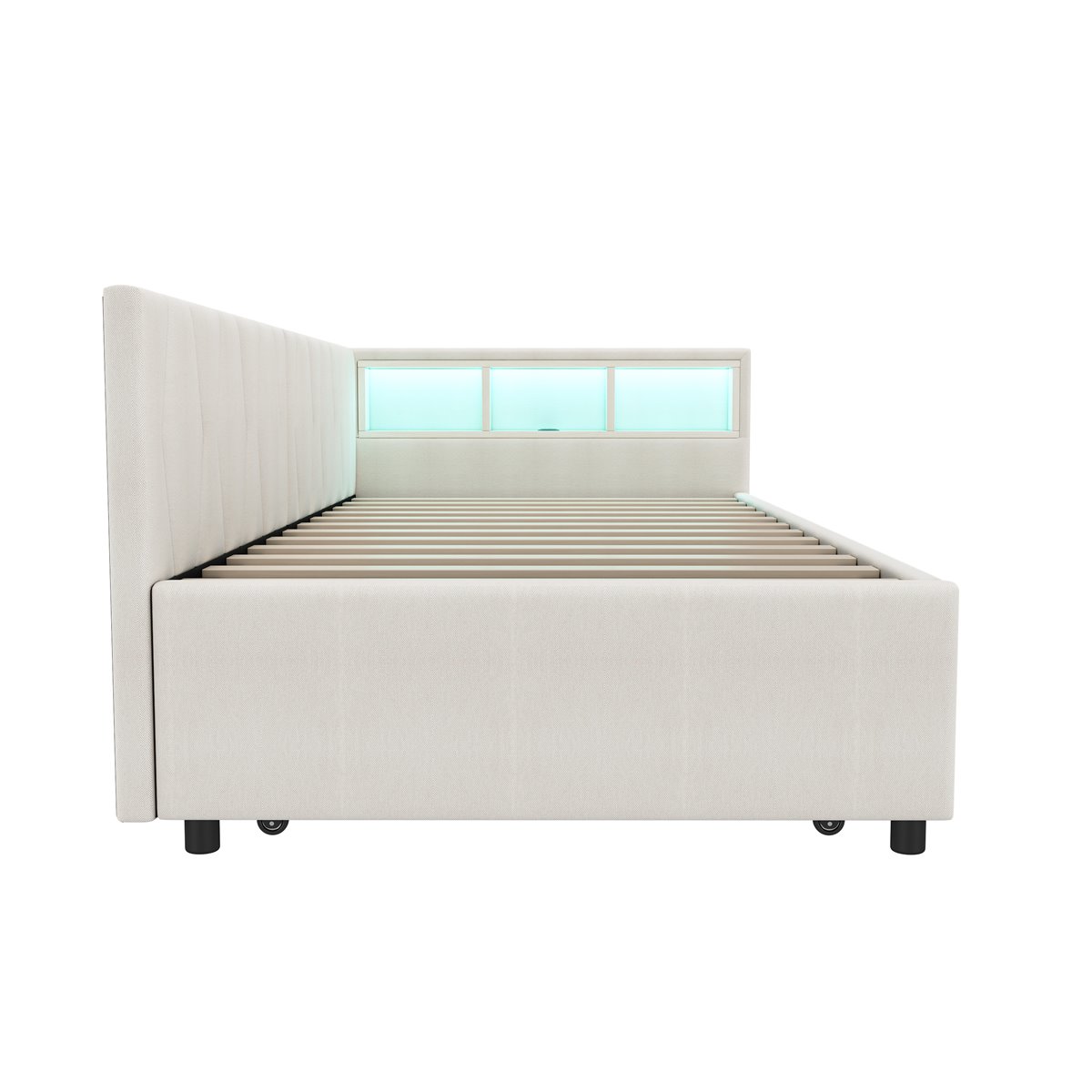 Disfruta de un dormitorio más práctico y organizado con este elegante y multifuncional Daybett. Con un diseño moderno y funcional, combina una cama de 90x200 cm con un práctico sofá, perfecto para optimizar el espacio en habitaciones pequeñas. El cabezal incorpora múltiples compartimentos de almacenamiento para mantener el orden en tu habitación, y su sistema de luz ambiental LED con control remoto crea una atmósfera romántica y acogedora. Además, con puertos de carga USB y Tipo C, podrás cargar tus dispositivos de manera cómoda y sin complicaciones. Un diseño ideal para quienes buscan comodidad y eficiencia en su espacio.