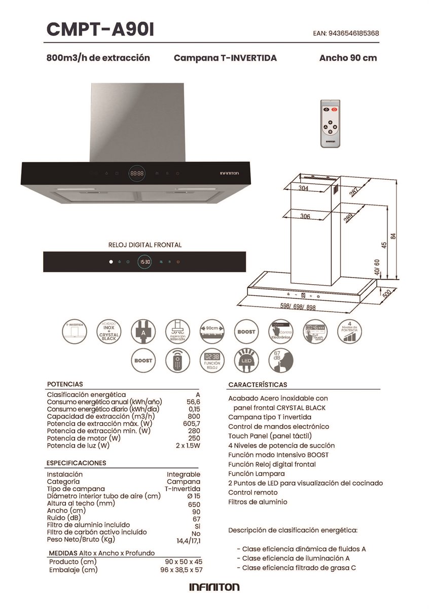 Modo Booster, Reloj Digital Frontal, Control Remoto, la campana Infiniton CMPT-A90I se adaptará a la perfección a su cocina.