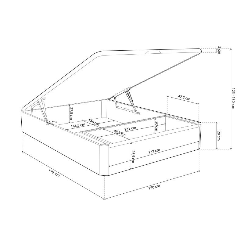 El canapé 150x190 abatible Luxury cambrian Max 3D es un mueble de dormitorio que te facilitará la vida con su gran espacio de almacenaje interior, un espacio adicional de 27,5 cm de altura interior en el que podrás guardar gran cantidad de textiles de gran formato –como edredones, sábanas, colchas, almohadas o cojines– o toda tu ropa de temporada, sacándoles mayor provecho a tus armarios.
