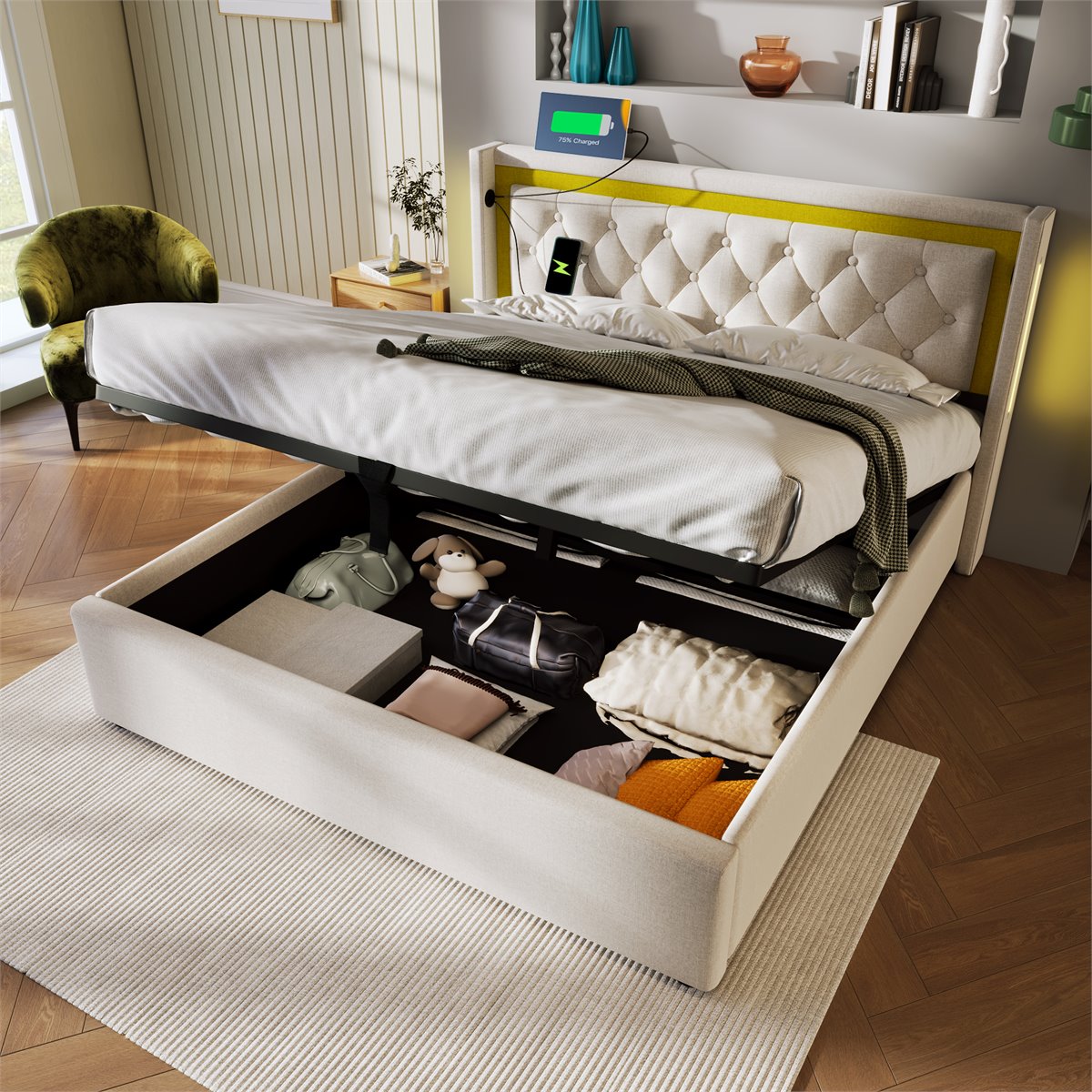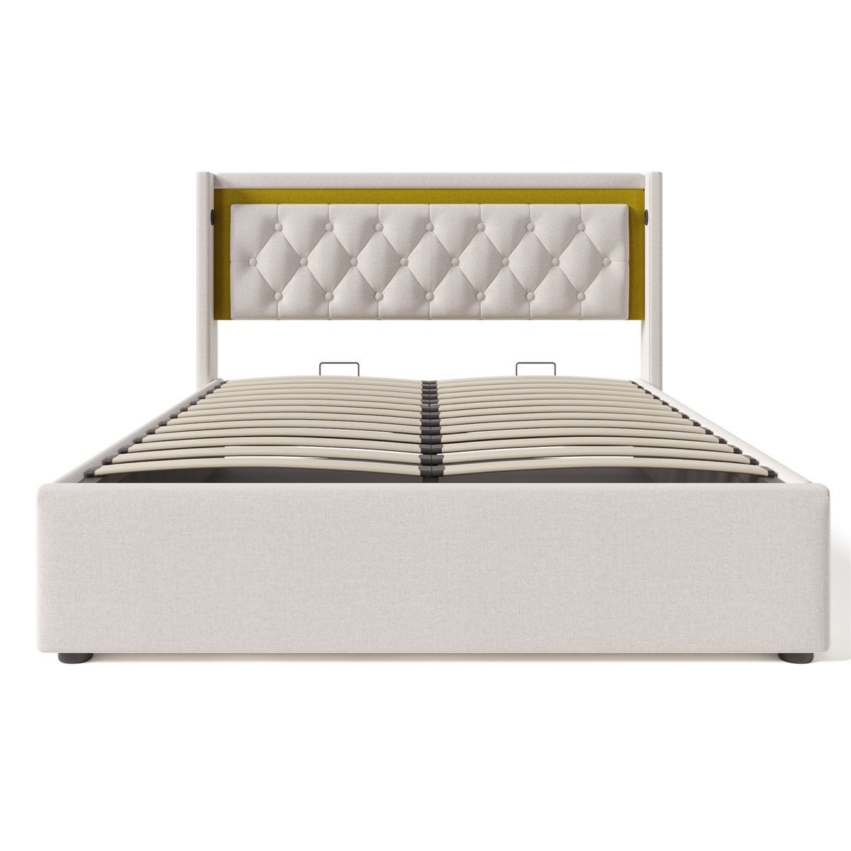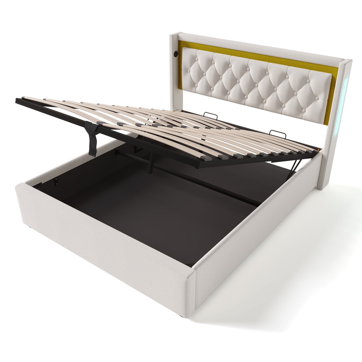 Disfruta de una experiencia de descanso única con esta cama tapizada LED de tamaño 140x200 cm. Diseñada para ofrecer comodidad y funcionalidad, cuenta con un elegante cabecero de algodón en color beige y un diseño de luces LED que se adapta a ambientes modernos y juveniles. La cama incluye un práctico sistema de carga USB y Tipo C en los laterales del cabecero para que puedas cargar tus dispositivos electrónicos sin necesidad de levantarte. Con un gran espacio de almacenamiento debajo del somier, es ideal para guardar mantas, almohadas o sábanas. Además, la estructura metálica asegura una gran durabilidad y estabilidad.