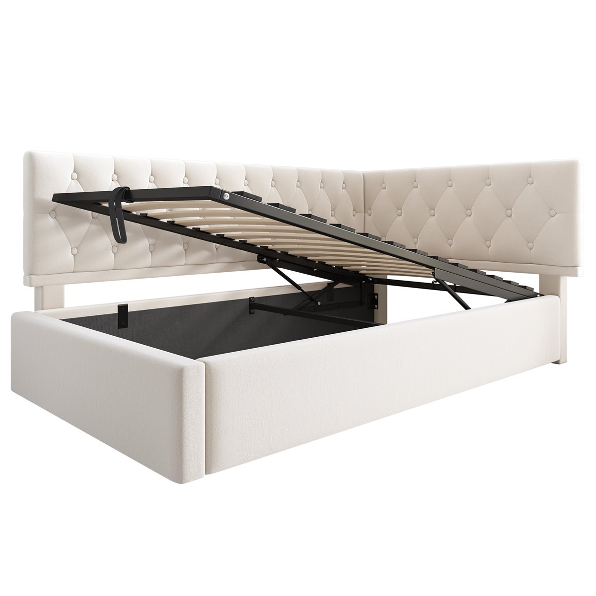 - Almacenaje Bajo la Cama: Equipada con un espacio de almacenamiento hidráulico, esta cama ofrece un amplio compartimiento oculto ideal para apartamentos pequeños. Con un práctico tirador, puedes abrir el almacenamiento fácilmente y acceder a tus pertenencias. Además, el paño protector mantiene el área de almacenamiento limpia y ordenada.